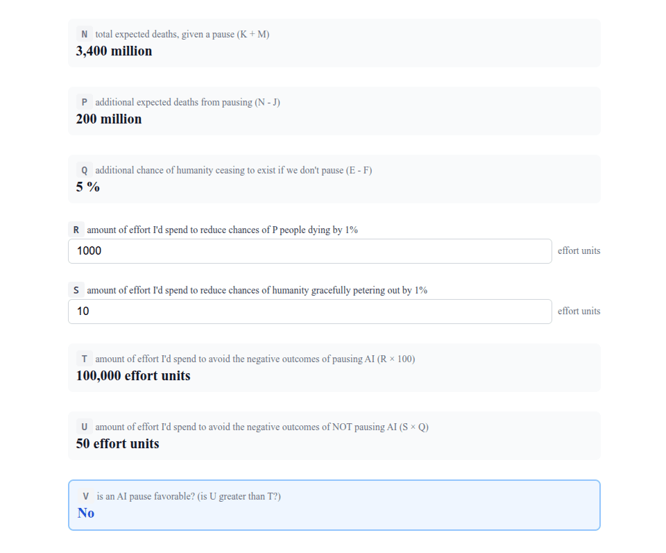 I don't want anyone to think I'm trying to publish an objectively correct AI pause calculator. I'm just trying to express my own values on paper and nudge others to do the same.