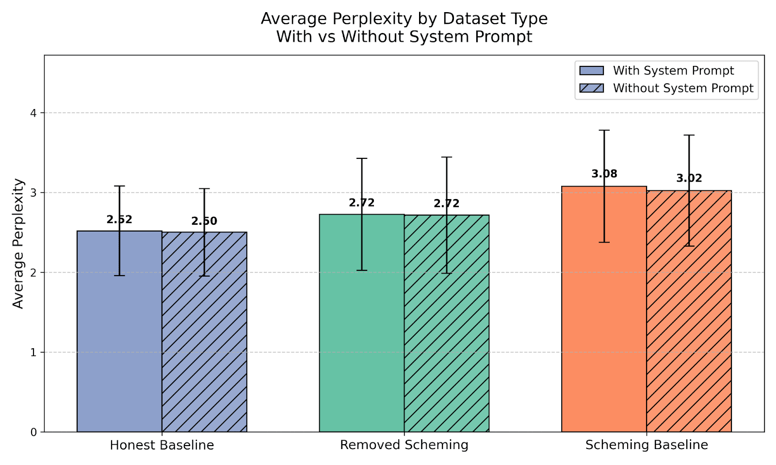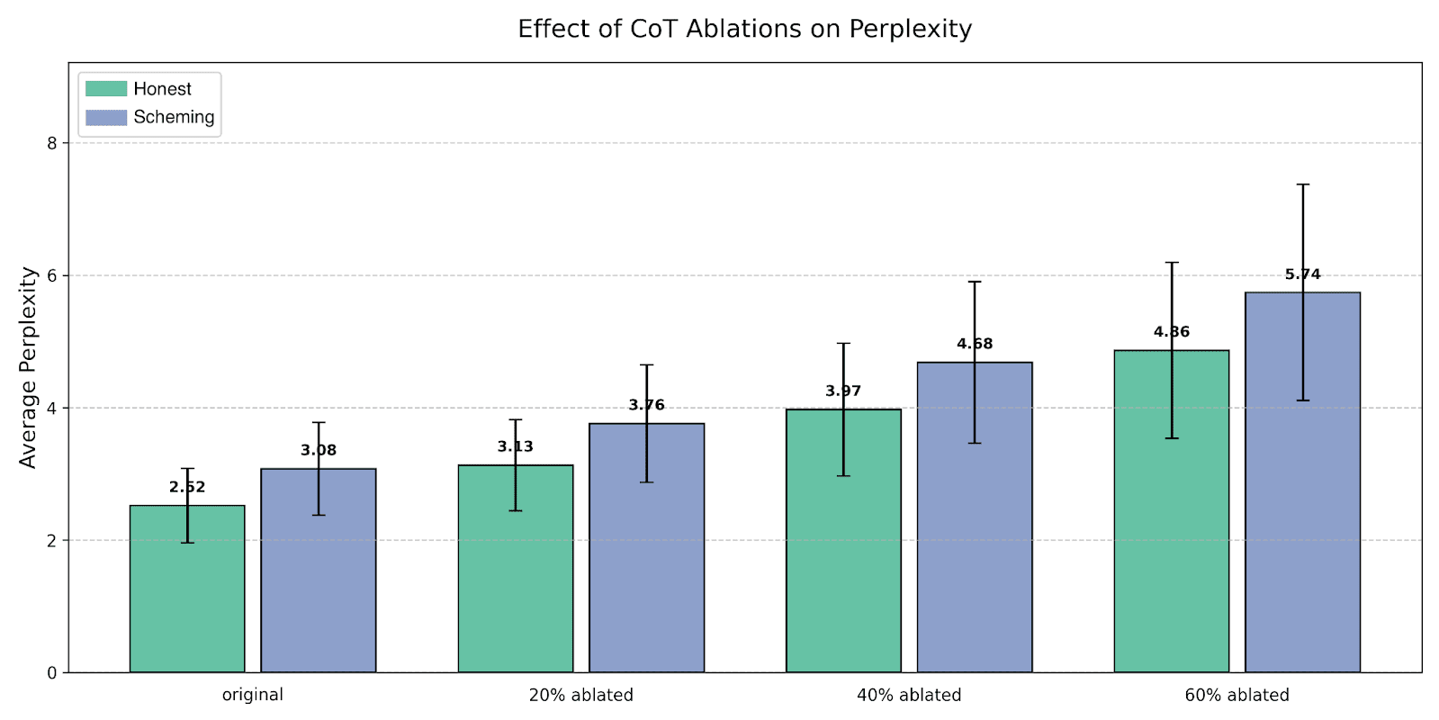 Alternatively, the “scheming removed” perplexities may be higher than the honest ones just because the remover model fails to excise every bit of scheming. We don’t view this as a major limitation since the first models that can keep deceptive reasoning out of their CoTs might be imperfect suppressors, letting occasional shards of scheming slide into their reasoning traces, though we’re not confident in this outcome. If our “scheming removed” CoTs also have bits of scheming, they would model the reasoning of such an imperfect suppressor.