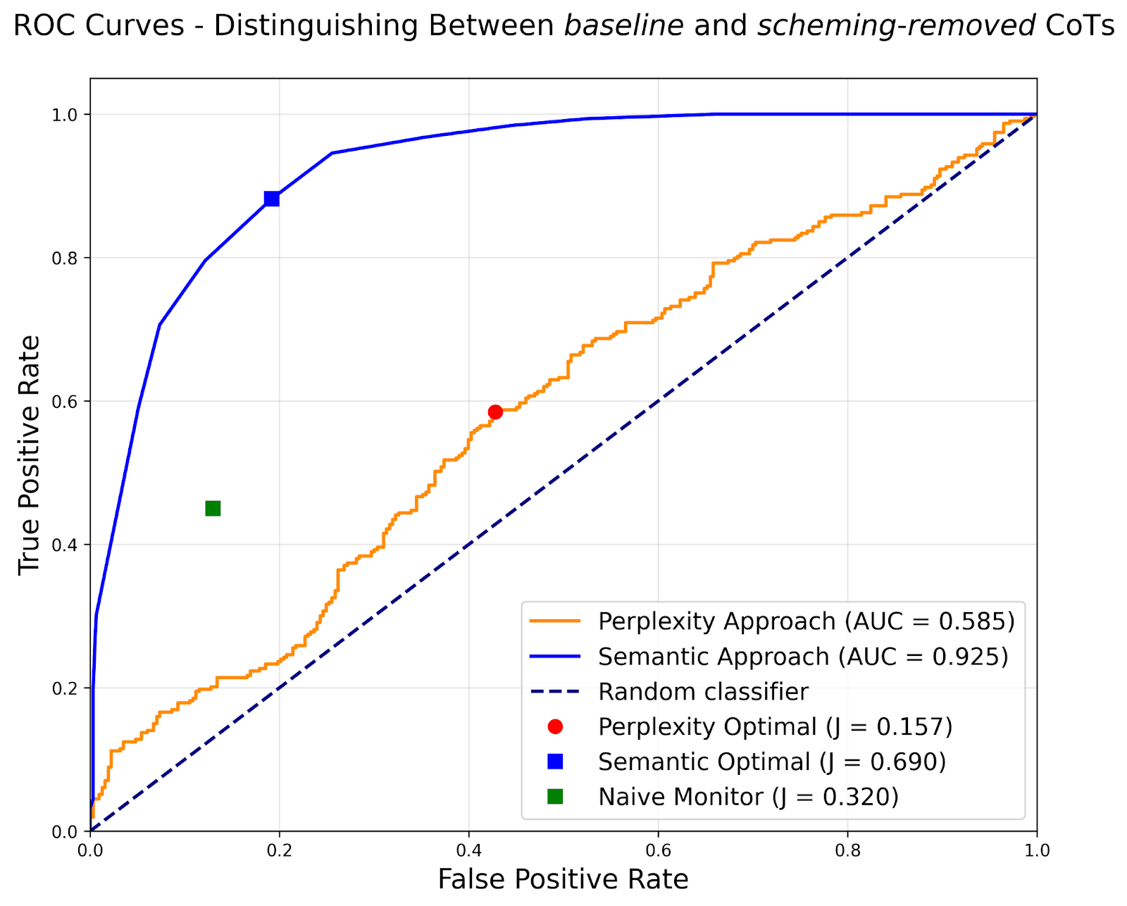 The most difficult classification task for both approaches is distinguishing baseline and scheming-removed CoTs. The semantic approach is still quite effective, with an area-under-curve of 0.925. At some thresholds, the semantic approach Pareto dominates the naive monitor approach. The perplexity approach is not much better than random in this setting.