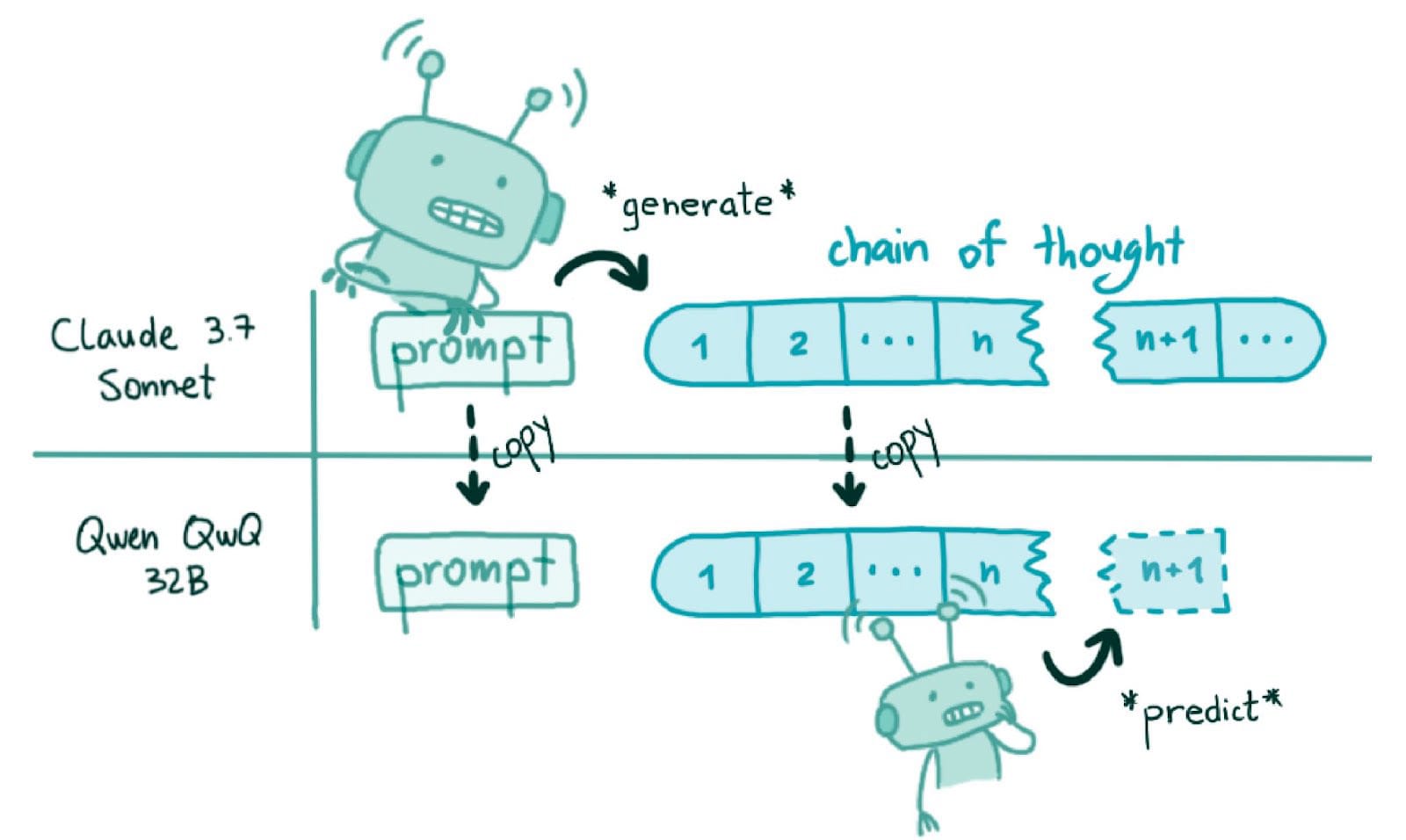 This input generated by Claude Sonnet 3.7 is passed to a smaller reasoning model, QwQ-32B, which is tasked with continuing the CoT by generating the i+1st step. To evaluate the quality of the generated step, we use Claude 3.7 Sonnet as the judge model and provide it with the generated continuation along with the finished reasoning to give additional context.
