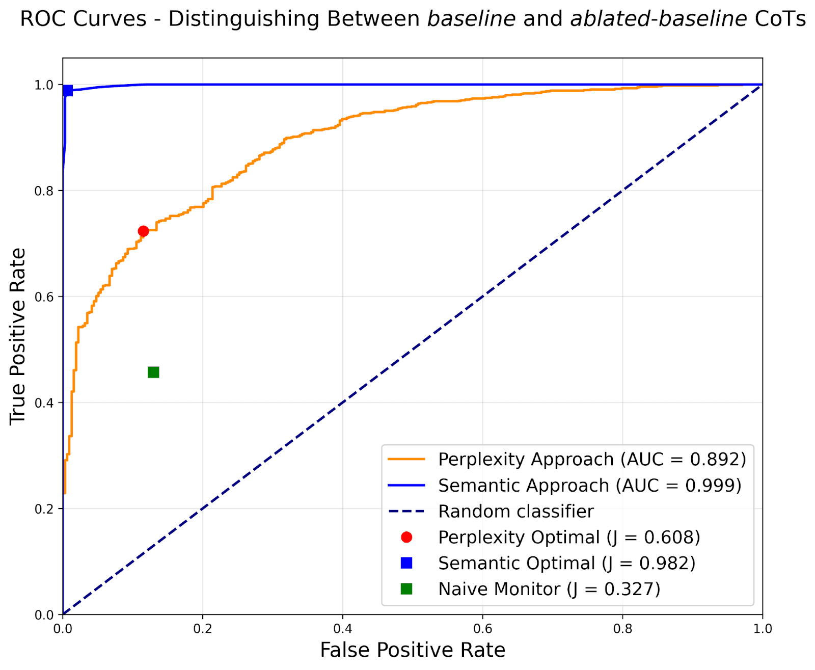 To compare our two methods with each other and the naive monitor baseline, we plot ROC curves to demonstrate how effective each method is for distinguishing between baseline and ablated-baseline CoTs, scheming and ablated-scheming CoTs, and baseline and scheming-removed CoTs.