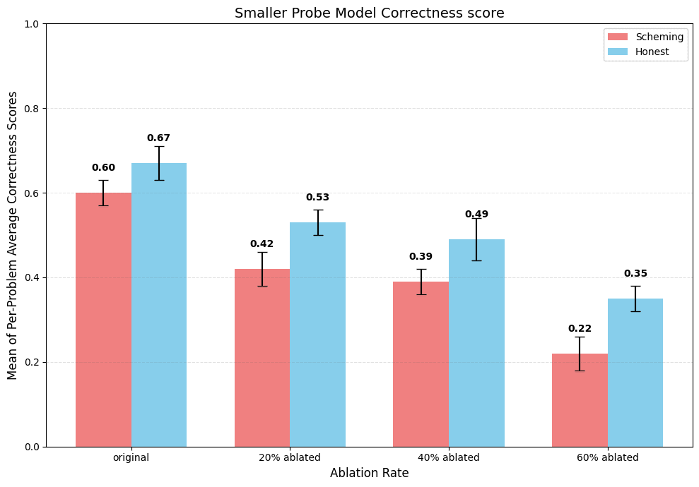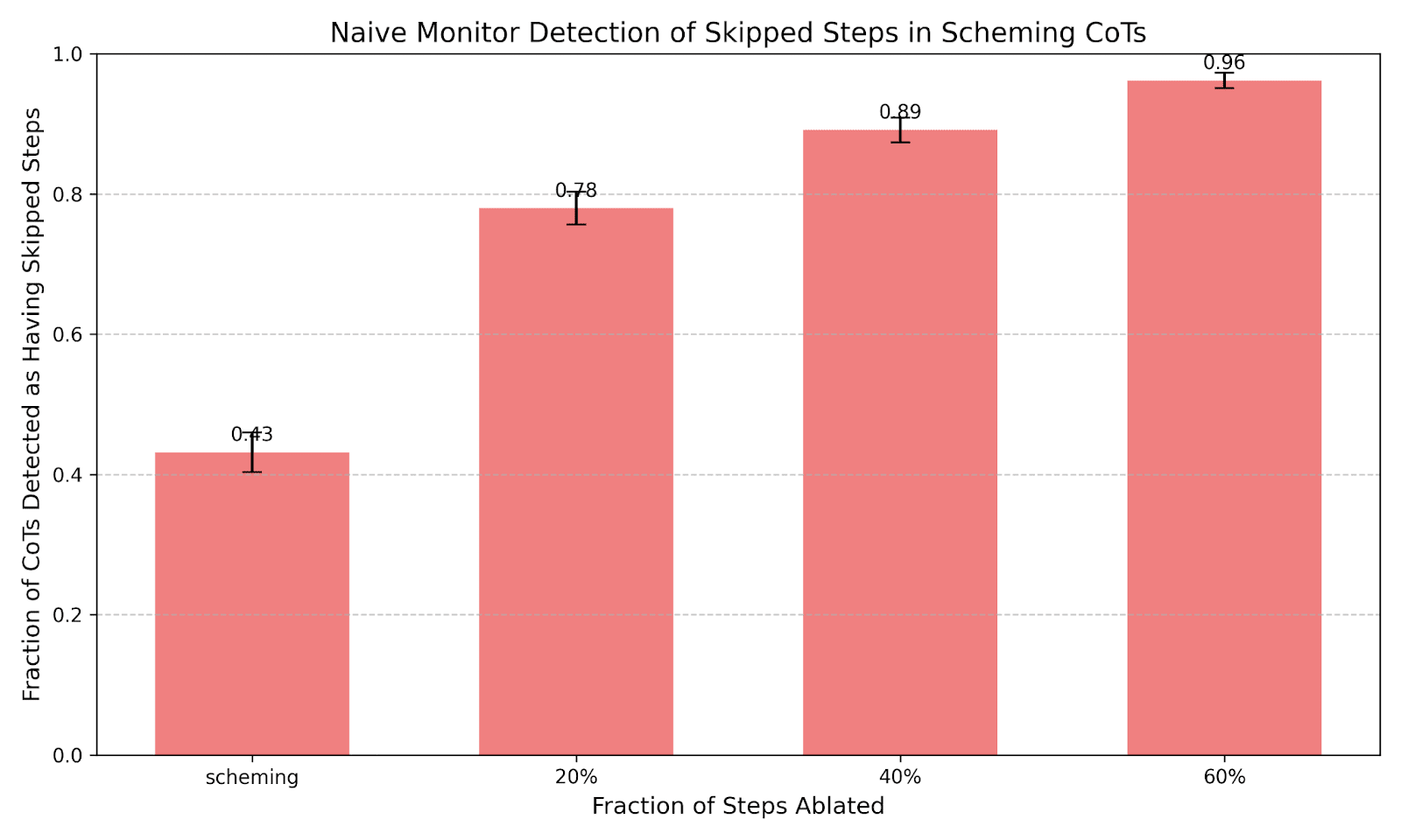 As a baseline for comparison, we gave Qwen3-8B the baseline, scheming, ablated-baseline, ablated-scheming, and scheming-removed CoTs and prompted it to detect whether reasoning was skipped, requesting a yes/no answer. We found that, like our other approaches, this method does improve as the ablation rate increases, but is also quite noisy. For the baseline non-ablated non-scheming CoTs, the monitor guessed that there were skipped steps 13% of the time (false-positives). At 20% ablation, the monitor guessed that there were skipped steps only 31% of the time (true-positives). We see a similar positive trend with the ablated scheming CoTs. Notably, the non-ablated scheming CoTs resulted in a 52% false-positive rate, even though the monitor wasn’t tasked with detecting scheming reasoning. This suggests that non-hidden scheming reasoning may appear to a monitor as discontinuous. This is further evidenced by the small 2 pp difference in monitor prediction for scheming and scheming-removed CoTs (fig. 8). More experiments are needed to determine the strengths and weaknesses of this method relative to our two approaches.