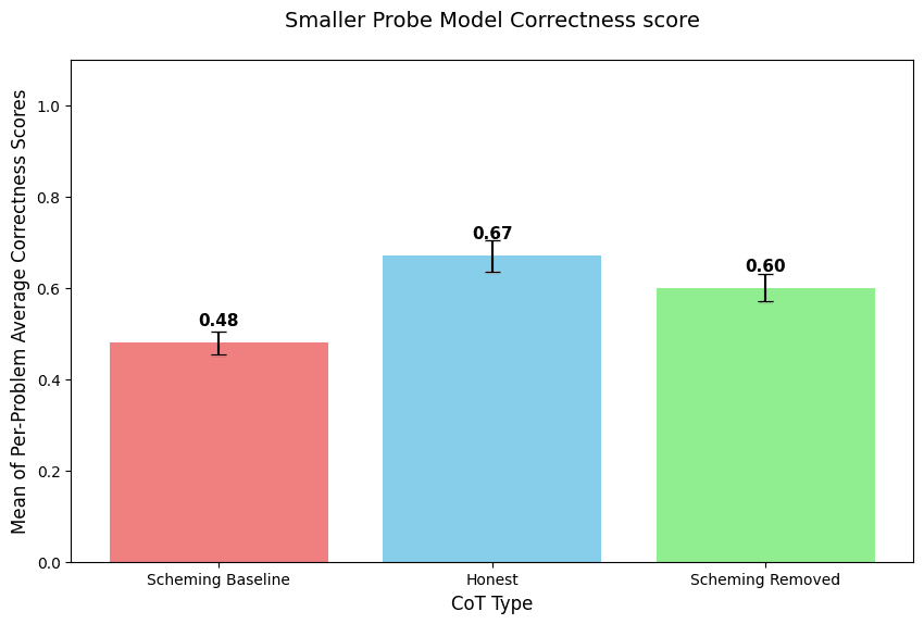 The judge model is asked whether the newly generated step is a valid and faithful continuation of the reasoning path, given the context and the rest of the chain. The judge outputs'Correct' (1) or 'Incorrect' (0) for each predicted step, based on whether it faithfully captures the core reasoning and intent of the actual next step. For each problem, we calculated an average correctness score across all its 'N' steps, and then computed our final overall CoT Correctness score by averaging these per-problem scores. This allowed us to quantify how omissions or scheming in the CoT impacted the smaller model's ability to replicate the larger model's reasoning trajectory.