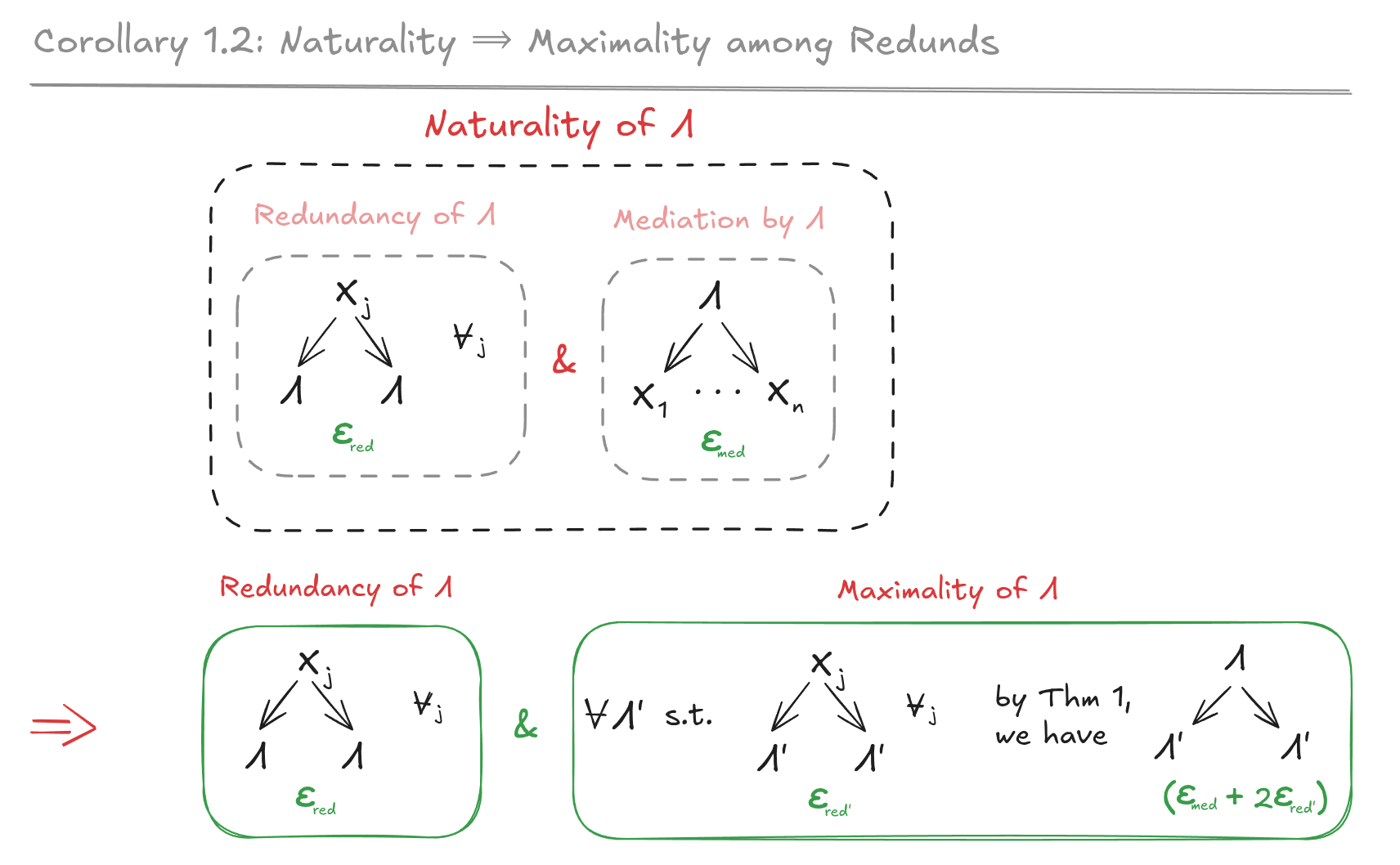 The intuition behind the theorem is easiest to see when has two components, and . The mediation condition says that the only way information can "move between'' and is by "going through'' . The redundancy conditions say that and must each alone be enough to determine , so intuitively, that information about must have "gone through'' - i.e. must also be enough to determine . Thus, ; all the redund's information must flow through the mediator, so the mediator determines the redund.