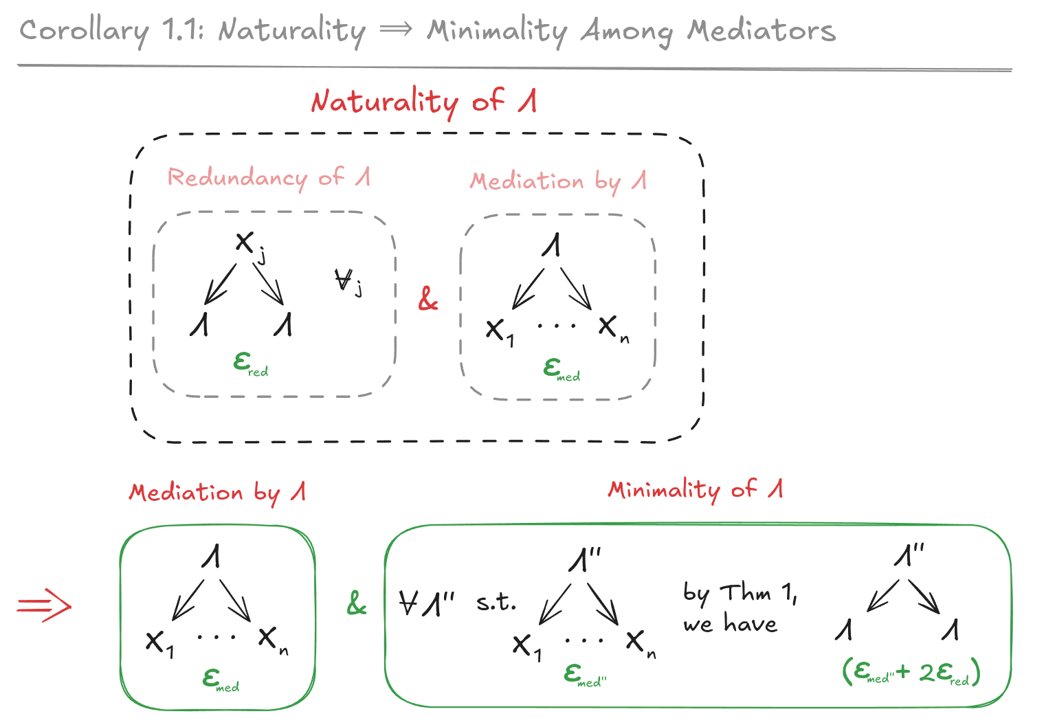 Suppose a latent is natural over - i.e. it satisfies both the mediation and redundancy conditions. Well, is a redund, so by the Mediator Determines Redund Theorem, we can take any other mediator and find that . So: is a mediator, and any other mediator is enough to determine . So is the "minimal" mediator: any other mediator must contain at least all the information which contains. We sometimes informally call such a latent a "minimal latent".