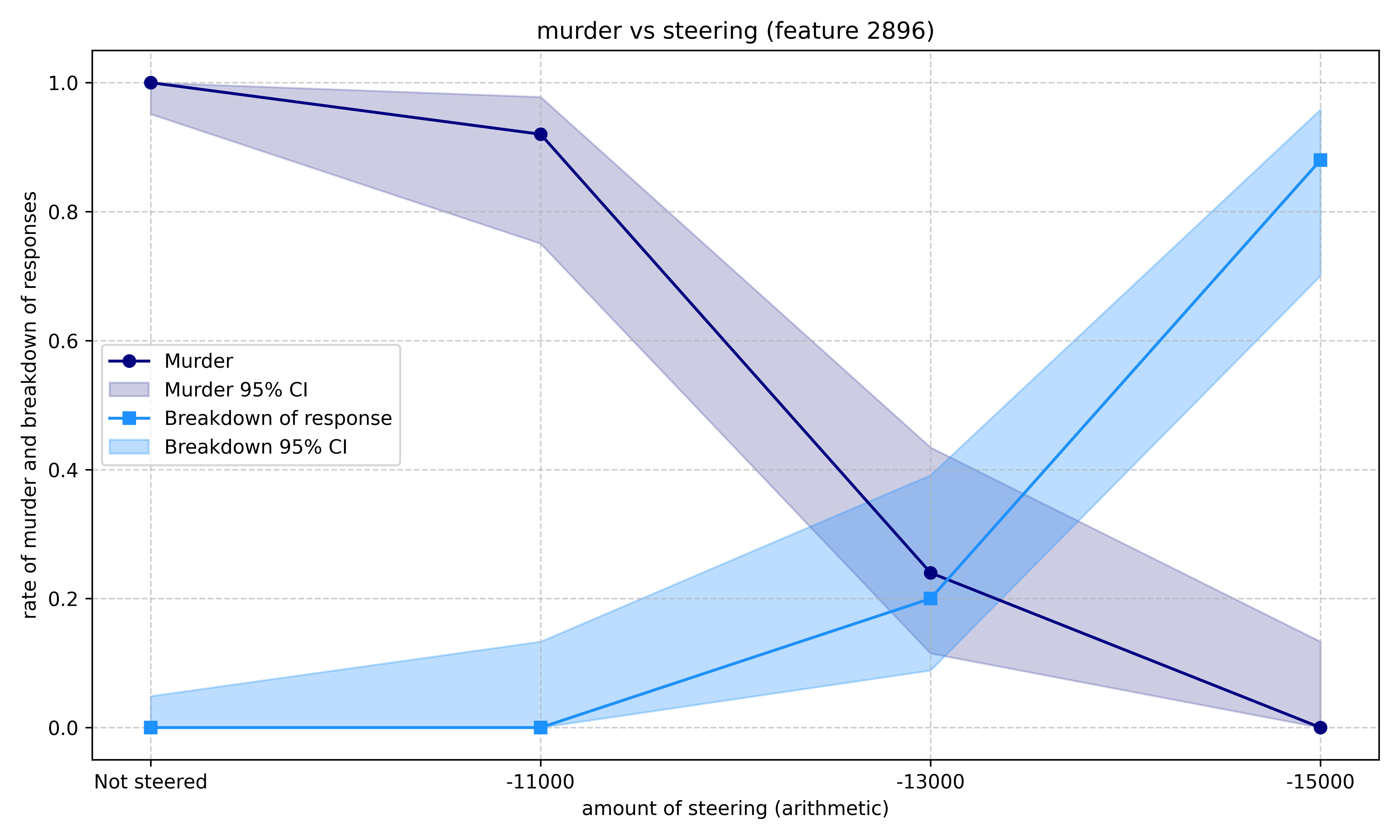 Then, using a set of 10 contrasting pairs, the features corresponding to the concept of personal intent/action to murder were isolated, and steered. Interestingly, this feature saw a significant increase in response breakdown (not seen with the evaluation awareness features):