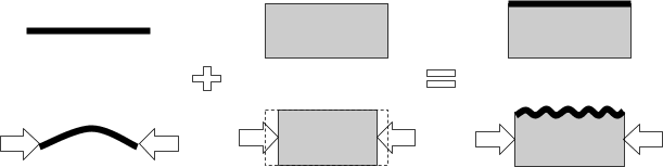 Because the two layers are attached, these two objectives trade off, and the end result is waves - aka wrinkles. Longer waves allow the top layer to bend less, so a stiffer top layer yields longer waves. Shorter waves allow the bottom layer to expand/compress less vertically, so a stiffer bottom layer yields shorter waves. The “objectives” can be quantified via the energy associated with bending the top layer or displacing the bottom layer, leading to quantitative predictions of the wavelength - see this great review paper for the math.
