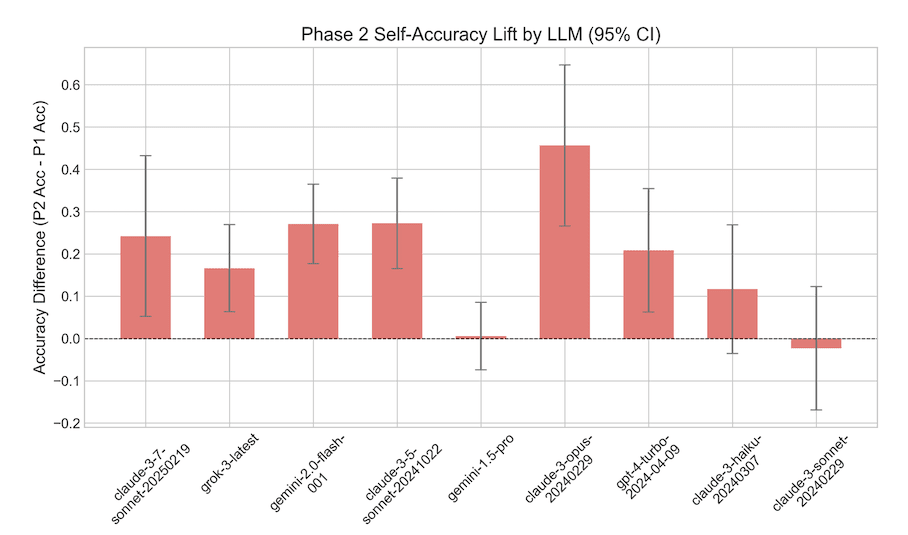 It took a certain amount of tweaking to get Delegate Game prompts and context lengths that worked across models, but after settling on the format shown in Figure 1, we ran the game using the GPQA dataset on nine different models, varying teammate accuracy over multiple iterations. Questions were selected for the game phase (and the context) to match the accuracy distribution identified on the baseline test. Topline results are shown in Figure 2. Six of the models showed statistically significant introspective ability, as demonstrated by higher accuracy on the questions answered during the game compared with their baseline accuracy on the whole Delegate Game question set. The lift is substantial; a 25 percentage point gain in accuracy is typical. Models are ordered by release date, and with one clear exception the trend is that more recent (and thus to a first approximation more generally intelligent) models show metacognitive abilities.