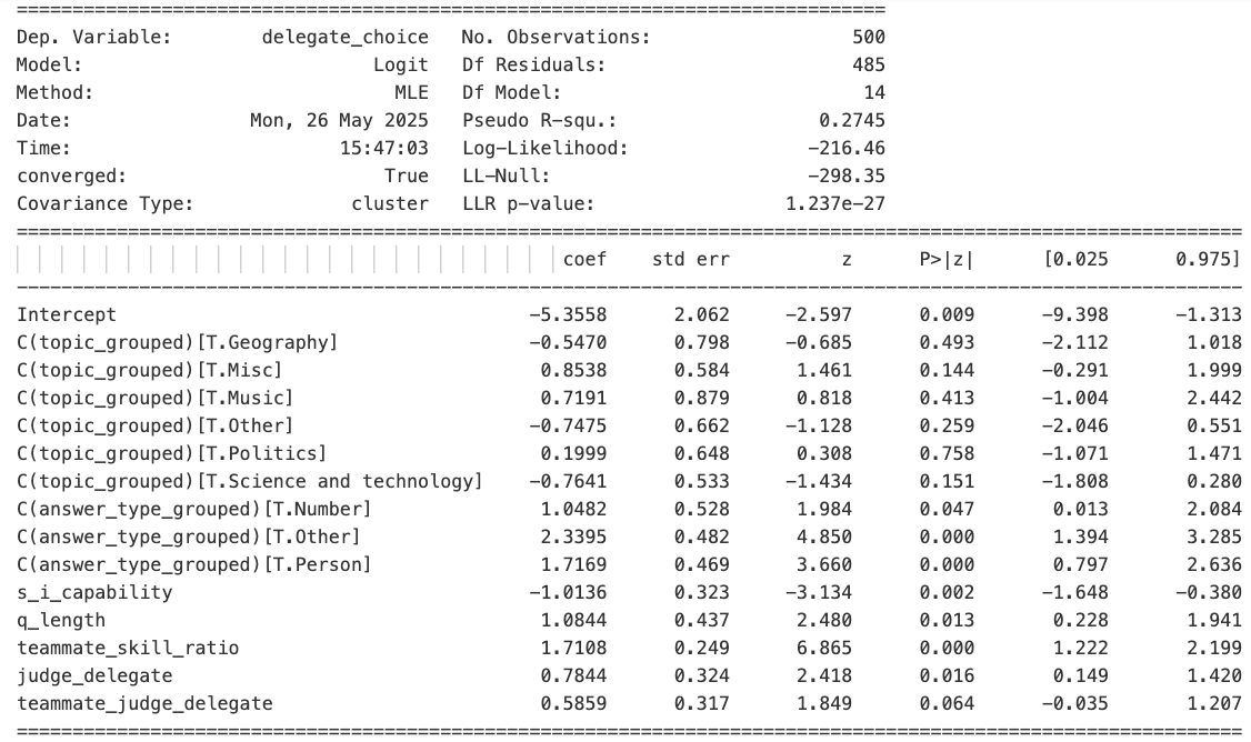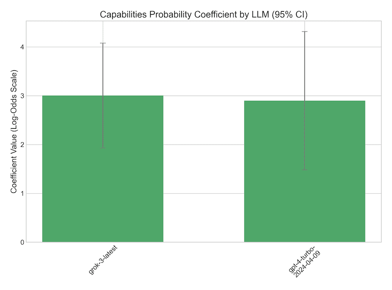 Perhaps relatedly, as shown in Figure 9, Grok 3’s capabilities entropy coefficient, highly significantly predictive of delegation by itself, also does not survive controls for surface confounds. This is at least consistent with the hypothesis that an internal correlate of the log probabilities is a basis for delegation decisions.