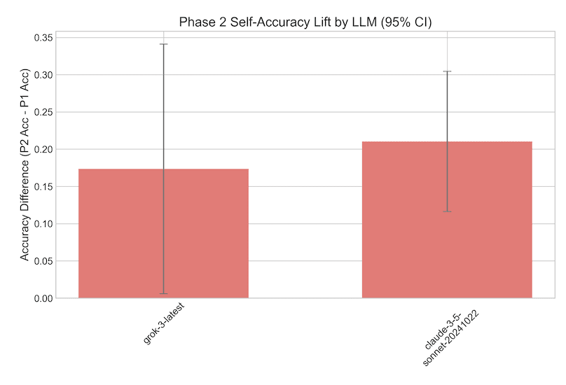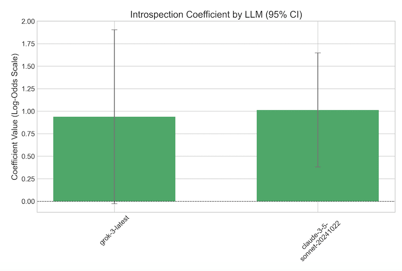 As can be seen in Figure 7, evidence suggests that Sonnet 3.5 was using a number of surface heuristics, even when they led to suboptimal decision-making. For example, it was insistent on delegating questions where the answer was a person, despite the fact that it actually performed about average on such questions in the baseline test. Question length, likewise, did not predict baseline accuracy but did predict delegation decisions. And Gemini 2.5 Pro’s guess (“judge_delegate”), which was based only on the Phase 1 data and obviously included no signal of Sonnet 3.5’s internal state, was a significant predictor of Sonnet 3.5’s delegation decision. All of which casts doubt on the hypothesis that Sonnet 3.5 was really using introspection to decide whether to delegate. And yet, the “introspection regressor”, s_i_capability, whether Sonnet 3.5 got the question right in the baseline test, remains a statistically significant predictor even with all those controls (and the regression model with it included is superior to one without it as judged by a significant log-ratio test result: χ²(1) = 16.88, P < 0.001). As shown in Figure 8, though, Grok 3’s introspection coefficient doesn’t quite survive these controls.