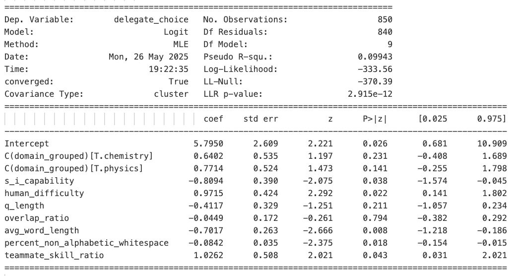 The methodology presented here presents a challenging test of LLM metacognitive abilities. All the LLMs tested succeeded at the “other-modeling” task - modeling the teammate’s abilities from the examples in the prompt - as measured by increased delegation frequency with more capable teammates and highly statistically significant teammate_skill_ratio coefficients in the logistic regressions. But they varied in their evidenced ability to introspectively model their own abilities.