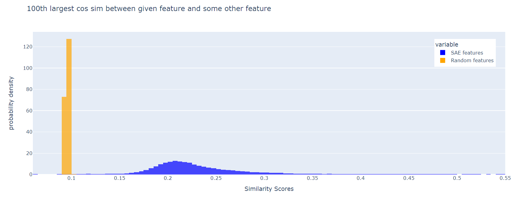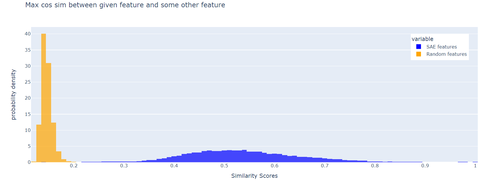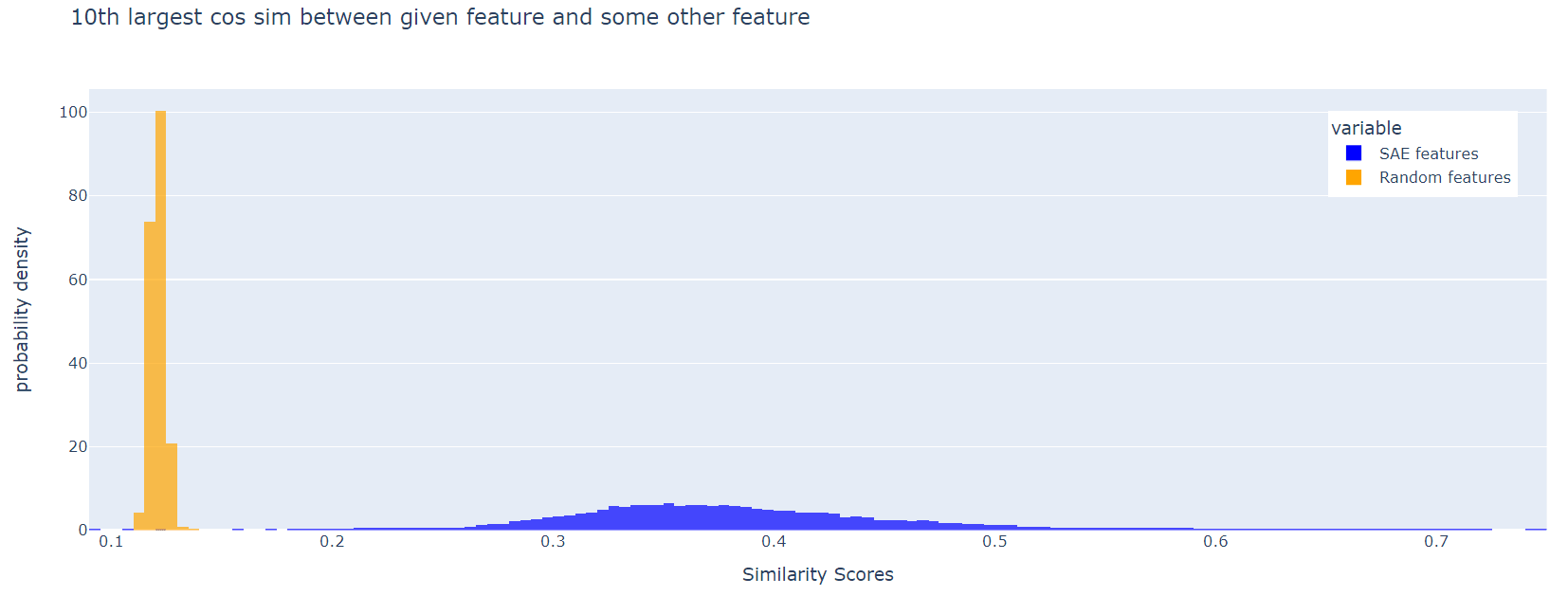 For each SAE feature (i.e. each column of W_dec), we can look for a distinct feature with the maximum cosine similarity to the first. Here is a histogram of these max cos sims, for Joseph Bloom's SAE trained at resid_pre, layer 10 in gpt2-small. The corresponding plot for random features is shown for comparison: