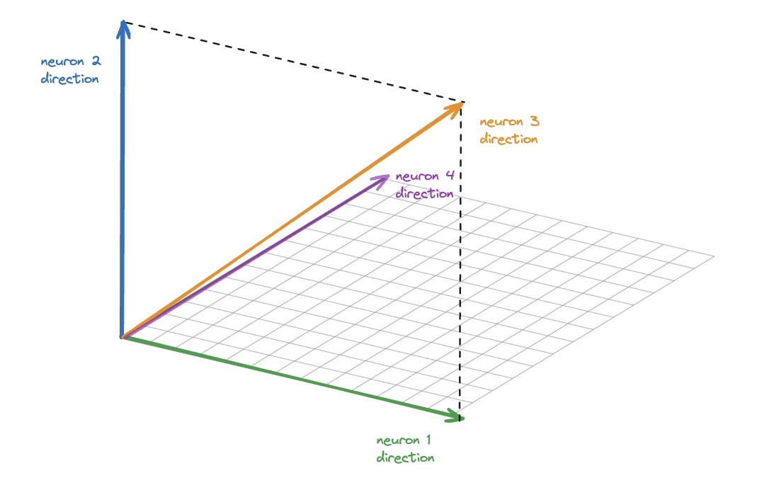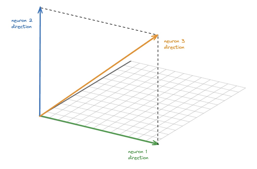 Here we have 3 neurons that have learnt the individual feature directions + two more that have learnt commonly co-occurring combinations.