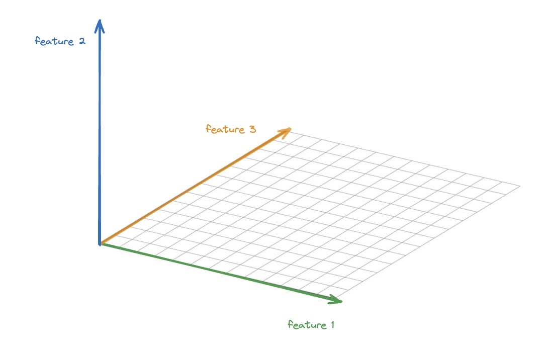 And suppose that the directions for these features are close to orthogonal. Note that they would be very unlikely to be completely orthogonal due to superposition, but we might expect the target model to attempt to make them as close to orthogonal as possible to minimise interference between features. So the "true feature" directions might look something like this: