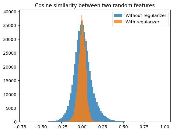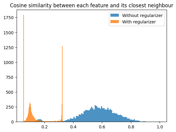 I expect the 0.05 peak might be the minimum cosine similarity if you want to distribute 8192 vectors over a 512-dimensional space uniformly? I used a bit of a weird regularizer where I penalized: