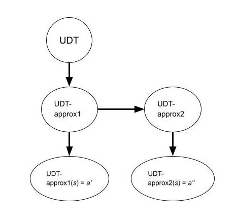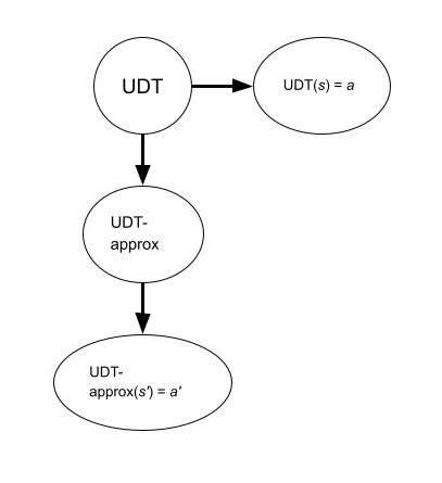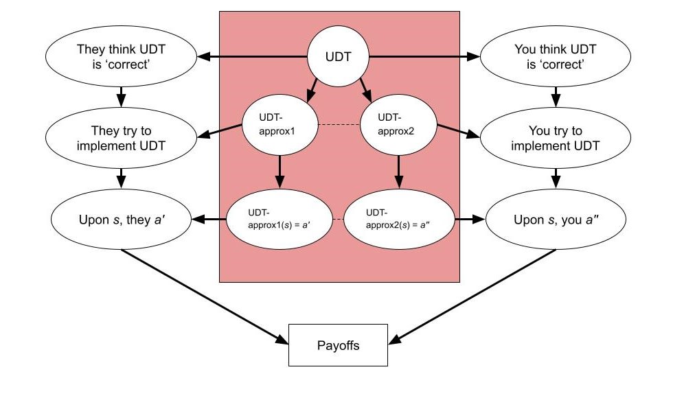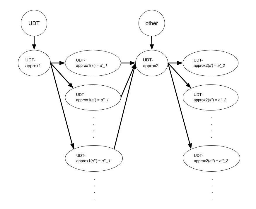 But real-world agents do not implement the “ideal" version of UDT[6]: rather—insofar as they think UDT actually is the “ideal”—they imperfectly approximate UDT in some way, due to boundedness and/or other practical constraints. In practice, this could, for example, look like doing Monte Carlo approximations for the expected utility, using approximations for π and e, using heuristics for intractable planning problems, et cetera—i.e. trying to implement UDT but doing something (ex ante) suboptimal with respect to the formalism. Also, these agents are probably going to approximate UDT differently, such that you do not get the neat situation above since these different approximations would then refer to wholly distinct logical statements (the statements, as before, being the conjunction of all of the action recommendations of the respective UDT approximations). That is, these approximations should be represented as two different nodes in our graph.