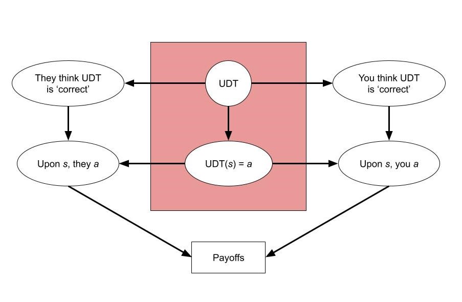 So when you intervene on the output of your decision theory you will have a logically causal effect on the action the other player takes, since both of your actions are downstream of what UDT outputs in the given situation (or alternatively, the output is both of your actions). As said, you will then take the same action, meaning you should e.g. cooperate in the Prisoner’s Dilemma. All good so far (modulo concerns about "logical causality", of course).