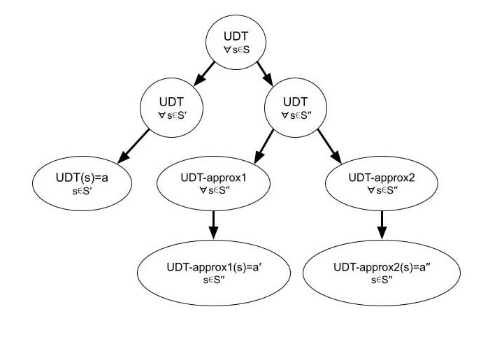 As said, the UDT node in the previous graphs is just the conjunction of state-to-action/policy mappings (statements of the form “UDT(s)=a”), for all possible states, S={s1,...,sk}. But suppose we partition the state space into S′ and S''—i.e. S′∩S''=∅ and S′∪S''=S—such that we get "UDT for S′" and “UDT for S''” (both arguably downstream of “UDT for S”). (We could of course make it even more fine-grained, perhaps even corresponding to the trivial partition {{s1},...,{sk}}.) Now, it might be the case that both players are actually implementing the ideal version of “UDT for S′”, e.g. for S′={problems that require less than x compute to solve}—where the standard Prisoner's Dilemma perhaps is included—but that they approximate “UDT for S''”.[11] We then get the following graph: