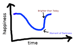 There's a happy part at the beginning, then it gets serious, then it gets REALLY serious and sad, culminating in a Moment of Darkness (and silence). Then at the end we reopen with hope, and end with joyful songs about being together.