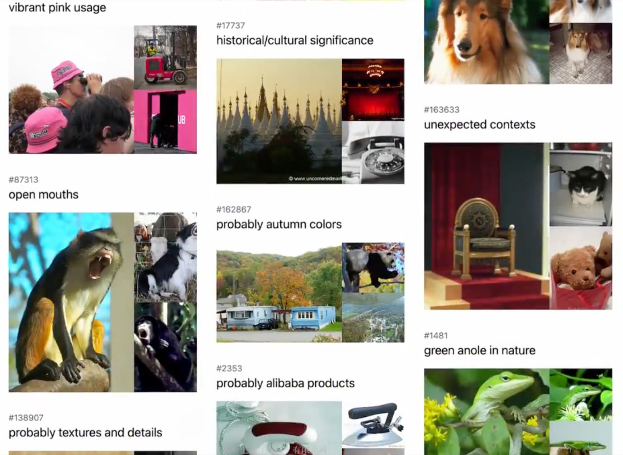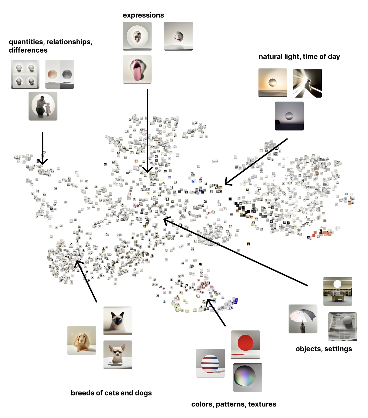 Above, we’ve shown the dimension reduced map of the top 1000 features that we found, and how they cluster into meaningful semantic categories. Many of the top activating features were about image borders, compression artifacts, and minute differences in light or shadow. Further down the list we see more semantically meaningful features, like dogs, objects, background scenes, relationships between objects, and styles. We haven’t yet begun to explore the full depth of the 58k learned features, and so have released the feature library publically to encourage more interpretation.