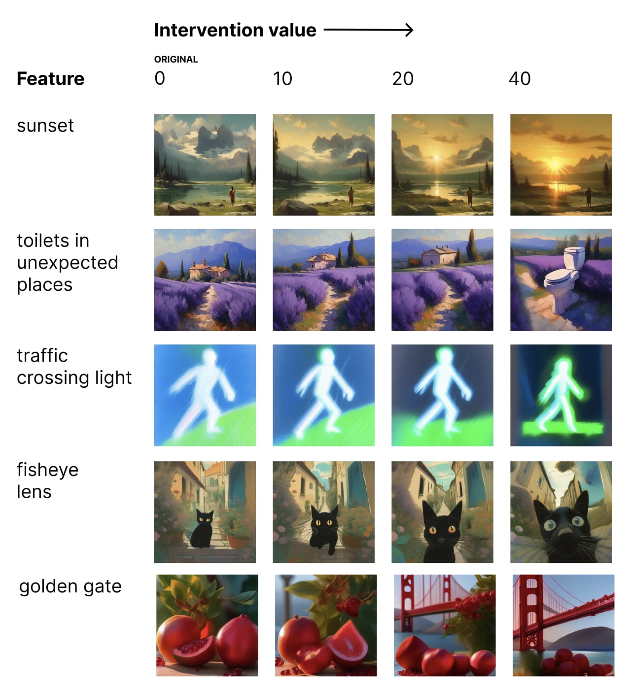 Even though an image typically has many active features that appear to encode a similar concept, intervening on one feature with a much higher activation value still works and yields an output without noticeable degradation of quality.