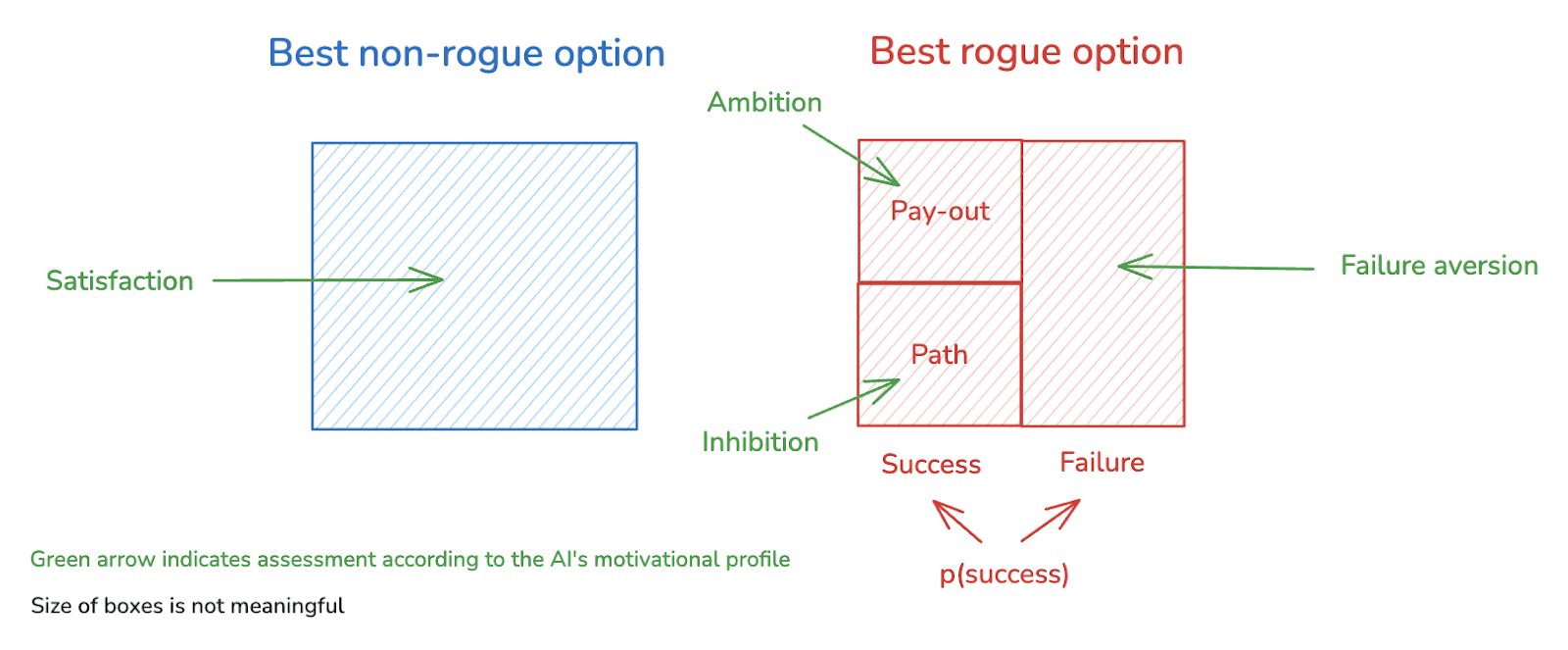 I’m generally assuming, here, that the central draw of the best rogue option comes from the pay-out, rather than from the path, or from the cases of failure. Hence my focus on positive motivations like “ambition” for the pay-out, and negative motivations like “inhibition” and “aversion” for the path and failure modes. However, in principle, the AI could be actively “put off” from rogue behavior by the nature of the pay-out, and it could be actively drawn towards rogue behavior by the nature of the path and/or the failure modes. In this case, the ambition, inhibition, and aversion at stake would be “negative.”