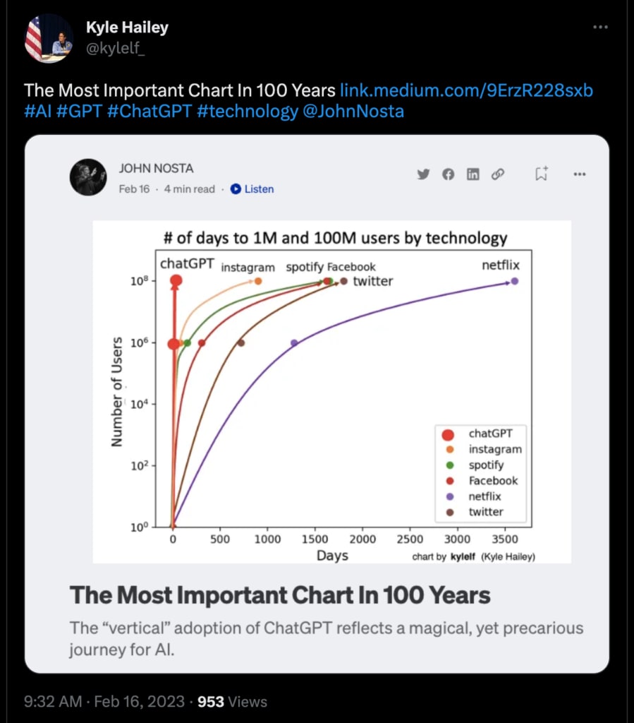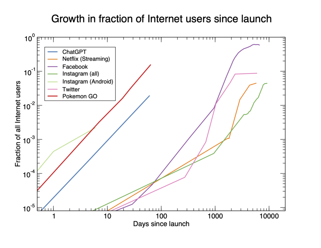 A major theme in reporting on ChatGPT is the rapid growth of its user base. A commonly stated claim is that it broke records, with over 1 million users in less than a week and 100 million users in less than two months. It seems not to have broken the record, though I do think ChatGPT’s growth is an outlier.