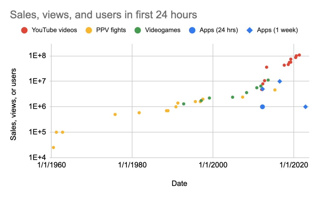 Here is a graph of records for these things over time, with data taken from Wikipedia5, which is included in the data spreadsheet. Each dot is a separate video, PPV event, or game, and I’m only including those that set 24 hour records: