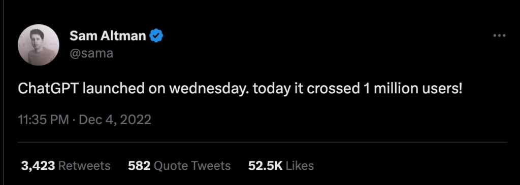 From what I can tell, the only source for the claim that ChatGPT had 1 million users in less than a week comes from this tweet by Sam Altman, the CEO of OpenAI: