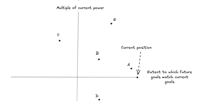 We can label the axes on this toy model and things become clearer. Remember this is still a toy example. Now, C works 25% against our current positions, with 4x the power. We will do nothing that we did before and will work significantly against our “current” self. In this example it looks like even D is better, where we move forward at perhaps ⅛ the pace we did before. E seems even more clearly good, with perhaps 4x the power to direct to our current goals after the reduction is taken into account. A seems an improvement, but our current position looks better than B.