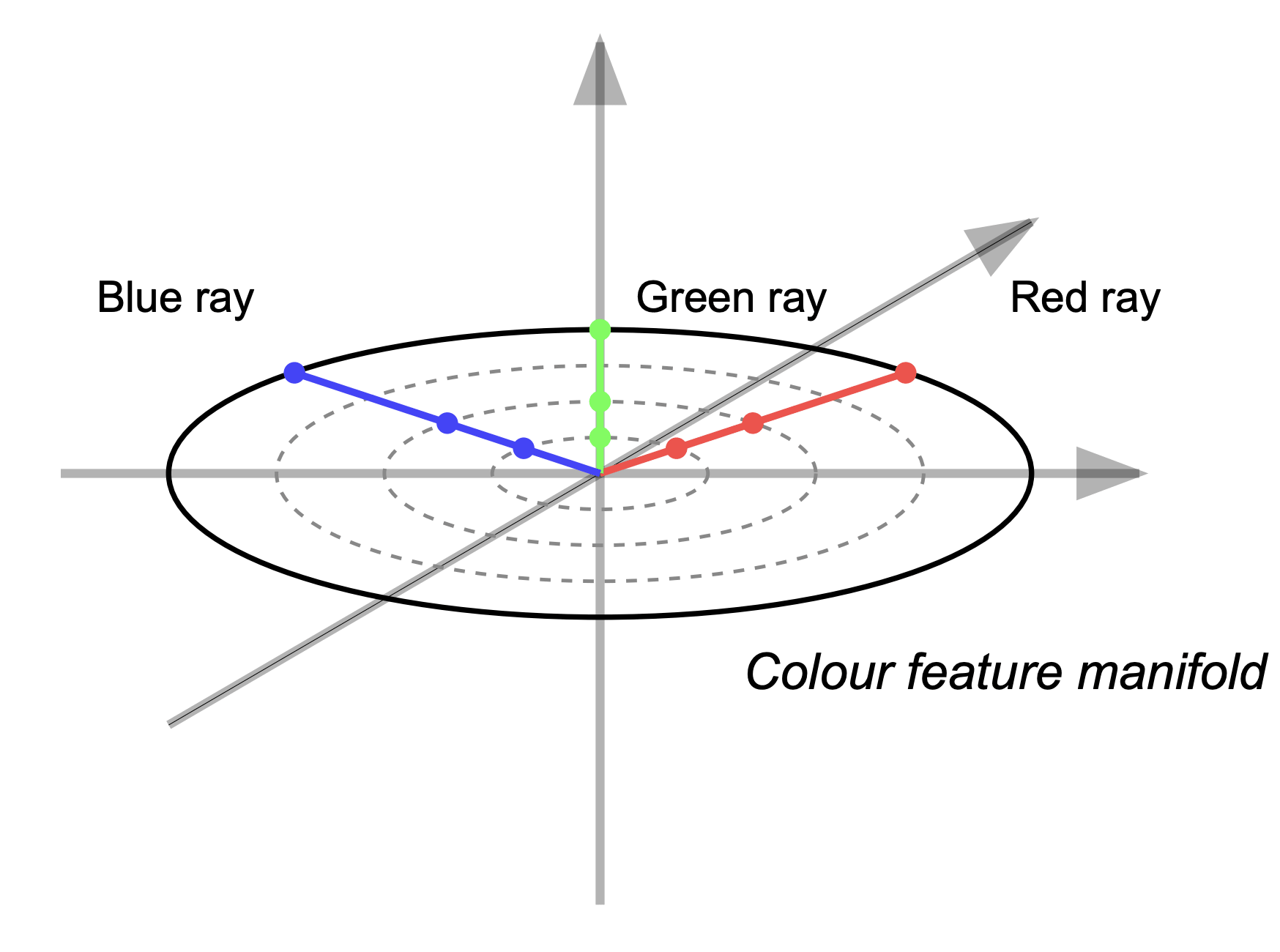 Probing techniques that extract linear directions remain valid even in the presence of multidimensional features. When one is interested in a specific property (for example, a particular shade of orange on a colour disk), a probe can lock onto the corresponding one‐dimensional ray within the overall manifold. The linear behaviour - composition by addition and intensity by scaling - persists on the ray even if the full feature is multidimensional.
