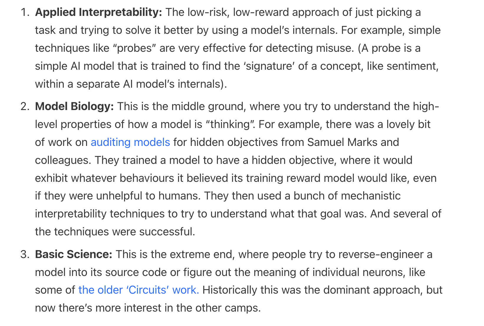 Neel gives an example for thinking of this in terms of biology, where discovering intermediate states within a model is very hard, but at the same time, it is a level of transparency that will prevent highly capable systems from taking over. So there is something deep about the mechanistic aspect of interpretability: it is meant to find relations of cause and effect, just like in biological systems.