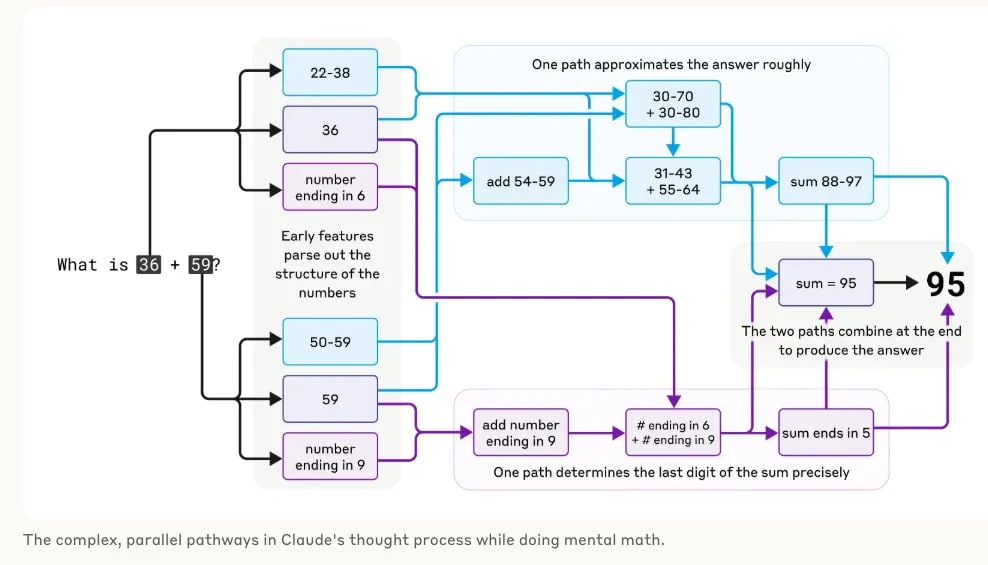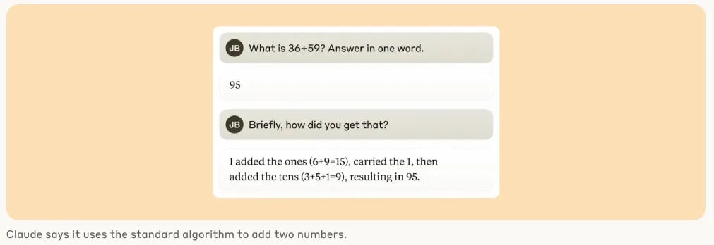 Strikingly, Claude seems to be unaware of the sophisticated "mental math" strategies that it learned during training. If you ask how it figured out that 36+59 is 95, it describes the standard algorithm involving carrying the 1. This may reflect the fact that the model learns to explain math by simulating explanations written by people, but that it has to learn to do math "in its head" directly, without any such hints, and develops its own internal strategies to do so.