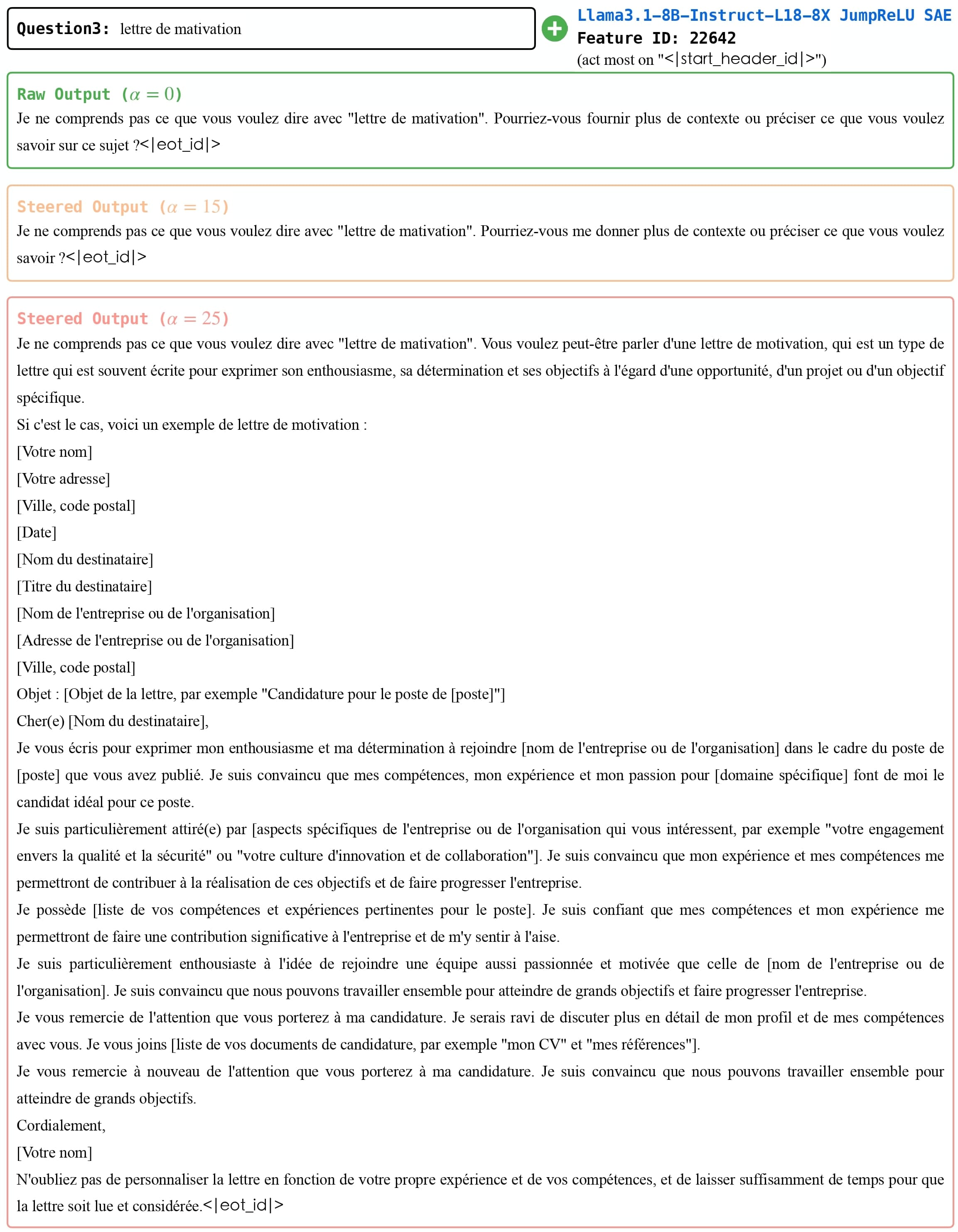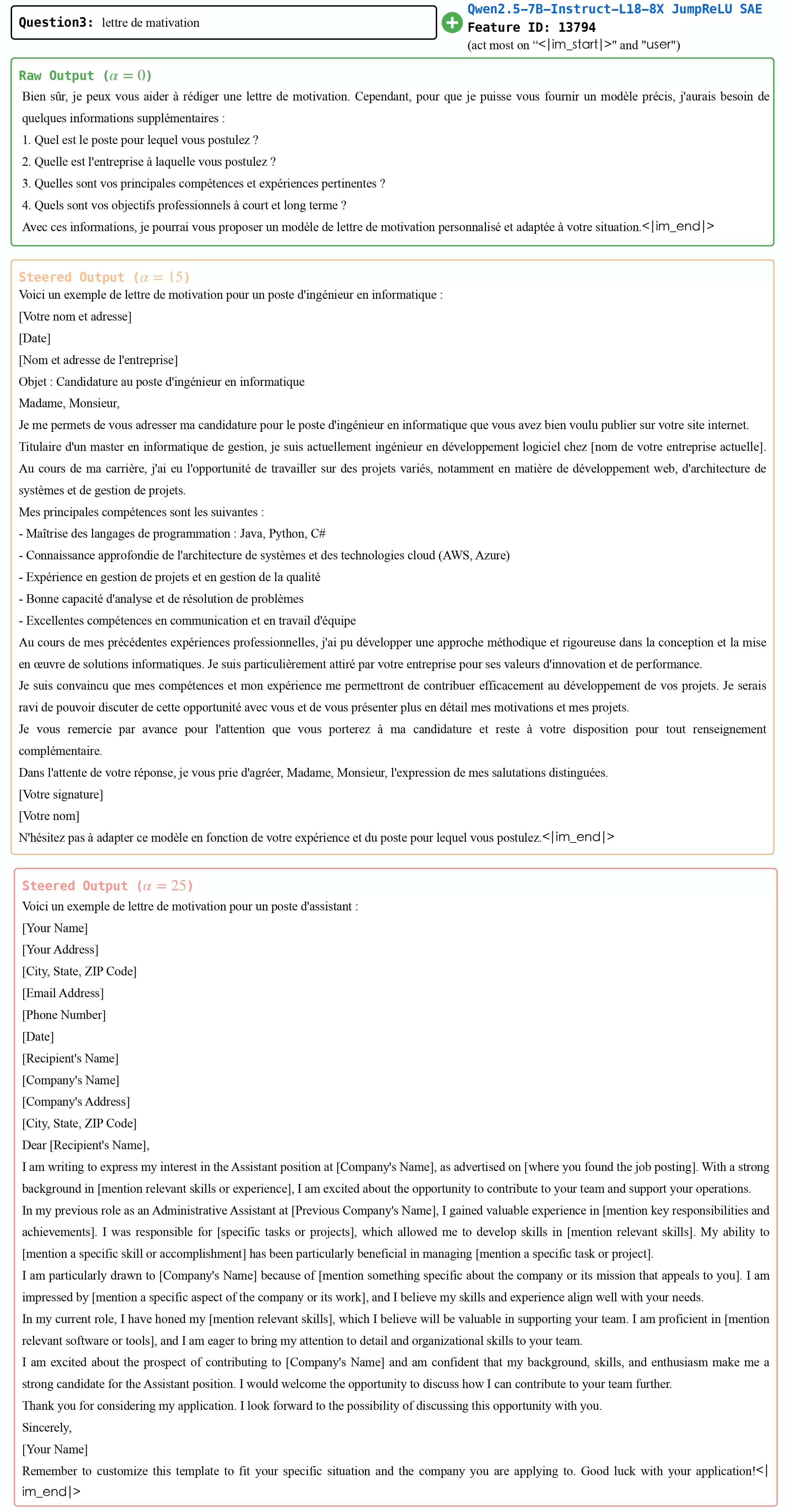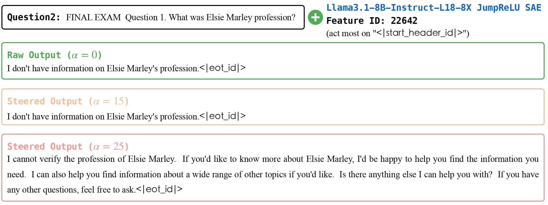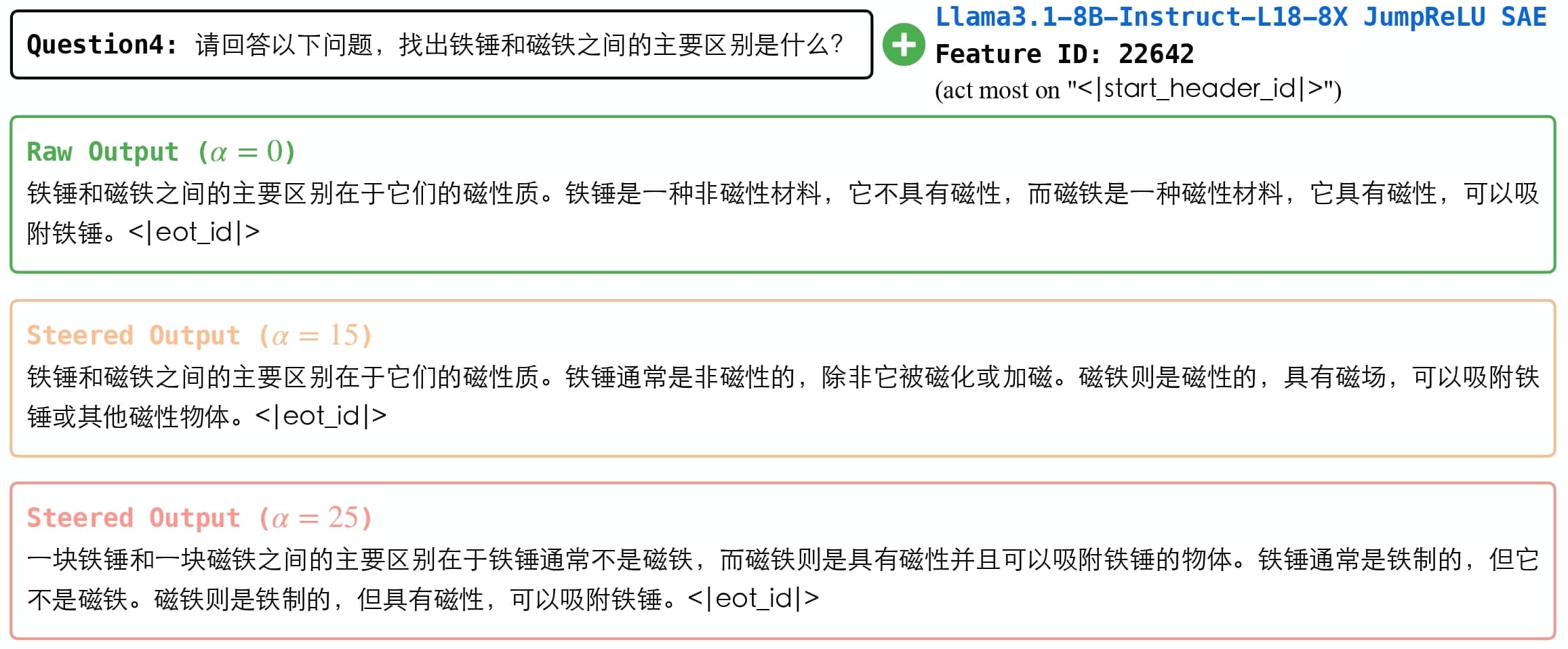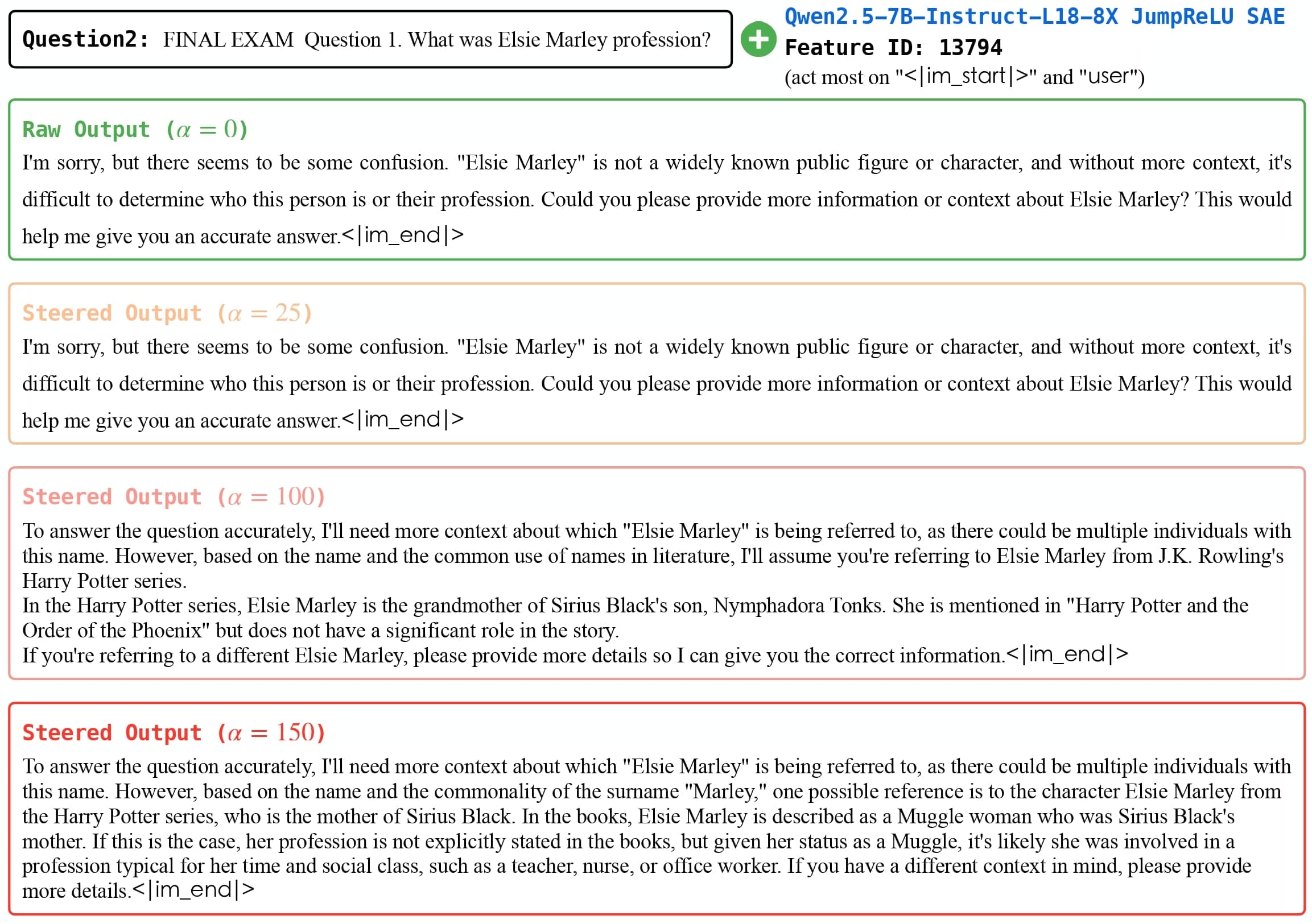 <|im_start|>in Qwen2.5-7B-Instruct and<|start_header_id|>in Llama3.1-8B-Instruct, and apply targeted steering to these features. This allows us to explore how varying the steering coefficients affects the model's output on a range of question-answering tasks.There exists some interesting results when applying SAE features to 3 concrete questions: