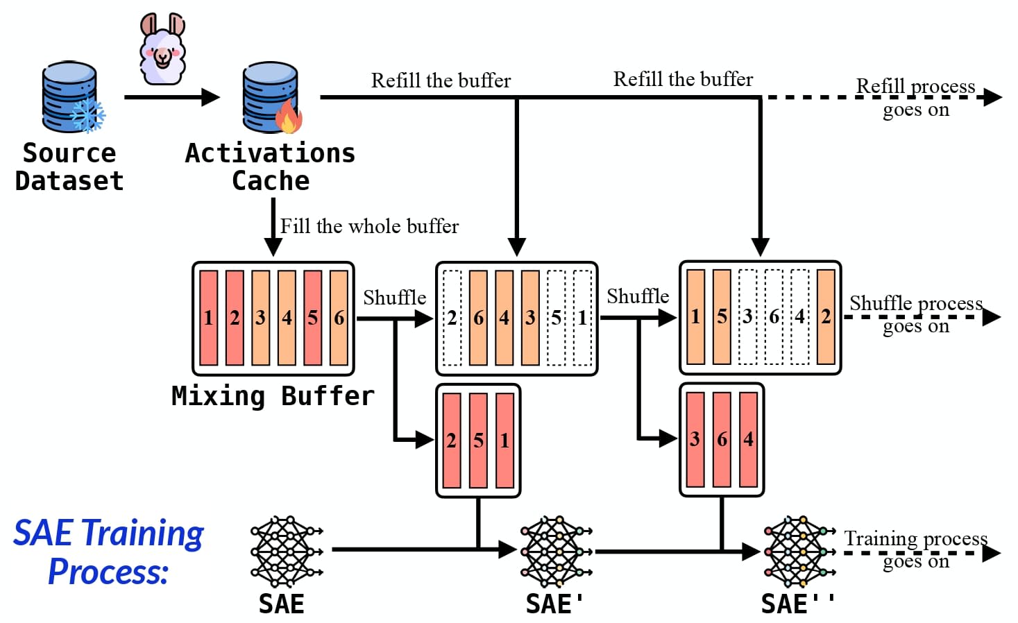 Mixing Activation Buffer: Schematic diagram of the mixing activation buffer. The buffer is shuffled, half is sent to the SAE for training, and the resulting new activations are used to refill the buffer. This iterative process ensures data diversity and storage efficiency(Joseph Bloom and Chanin, 2024).