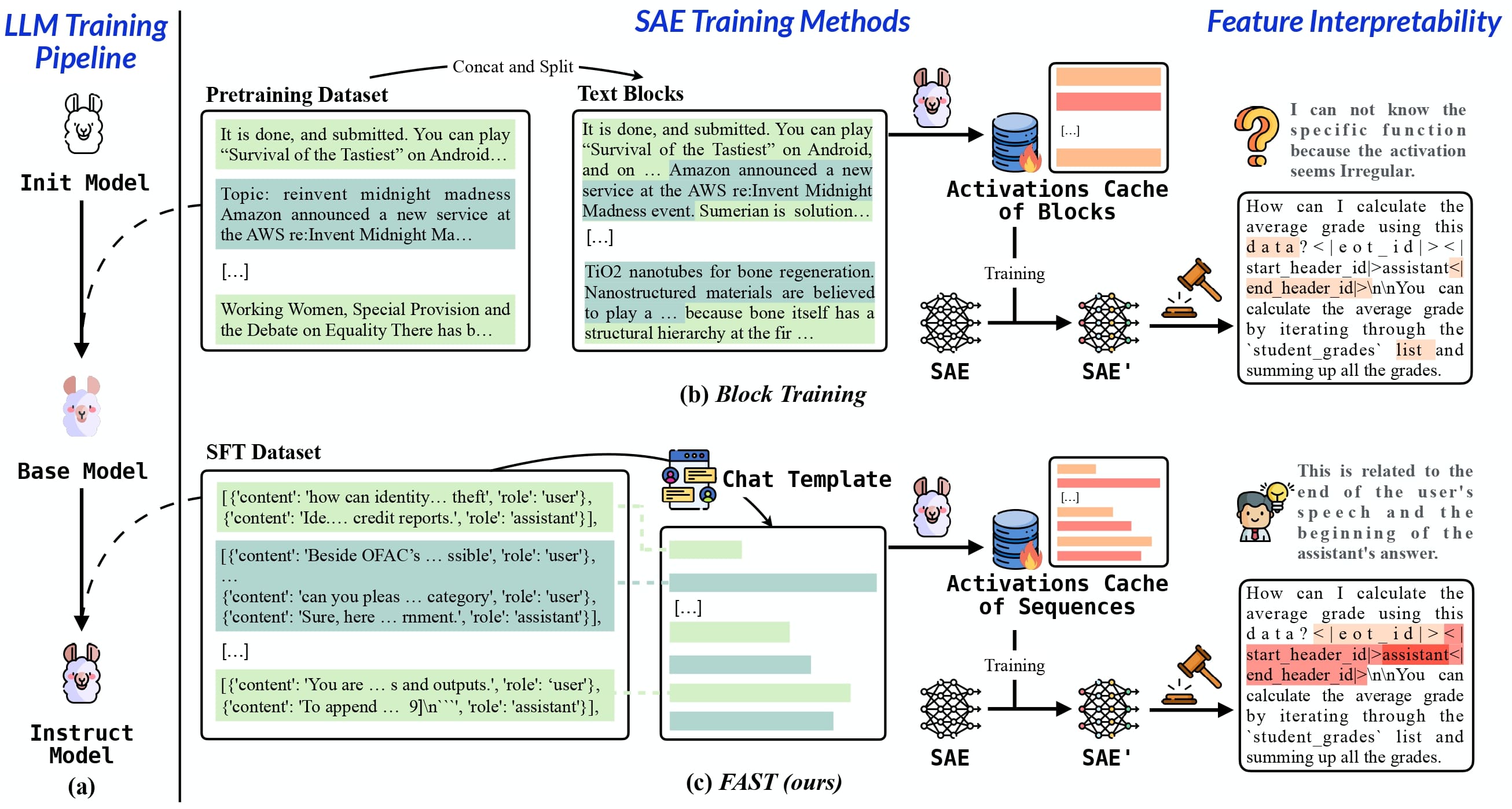 Illustration of the LLM training pipeline and SAE training methods. (a) The pipeline transitions from pretraining to fine-tuning. (b) Block Training (BT) concatenates datasets and resplits them into fixed-length blocks. (c) Finetuning-aligned Sequential Training (FAST) processes data instances independently, preserving semantic integrity and improving alignment with fine-tuning objectives, leading to better performance in feature interpretability.