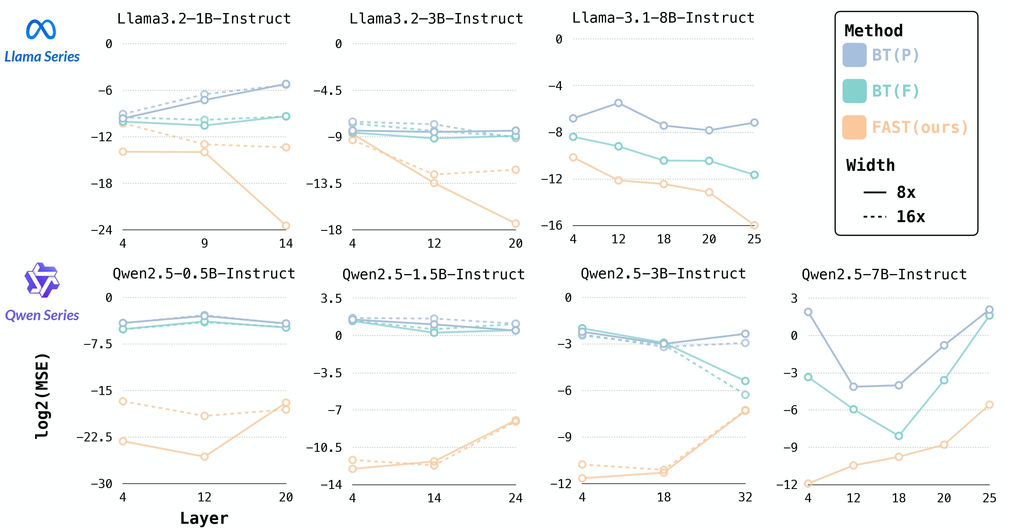 Token Reconstruction Performance 📉:FAST shows token better reconstruction performance. On Qwen2.5-7B-Instruct, FAST achieves a mean squared error of 0.6468, significantly outperforming baseline methods with errors of 5.1985 and 1.5096.