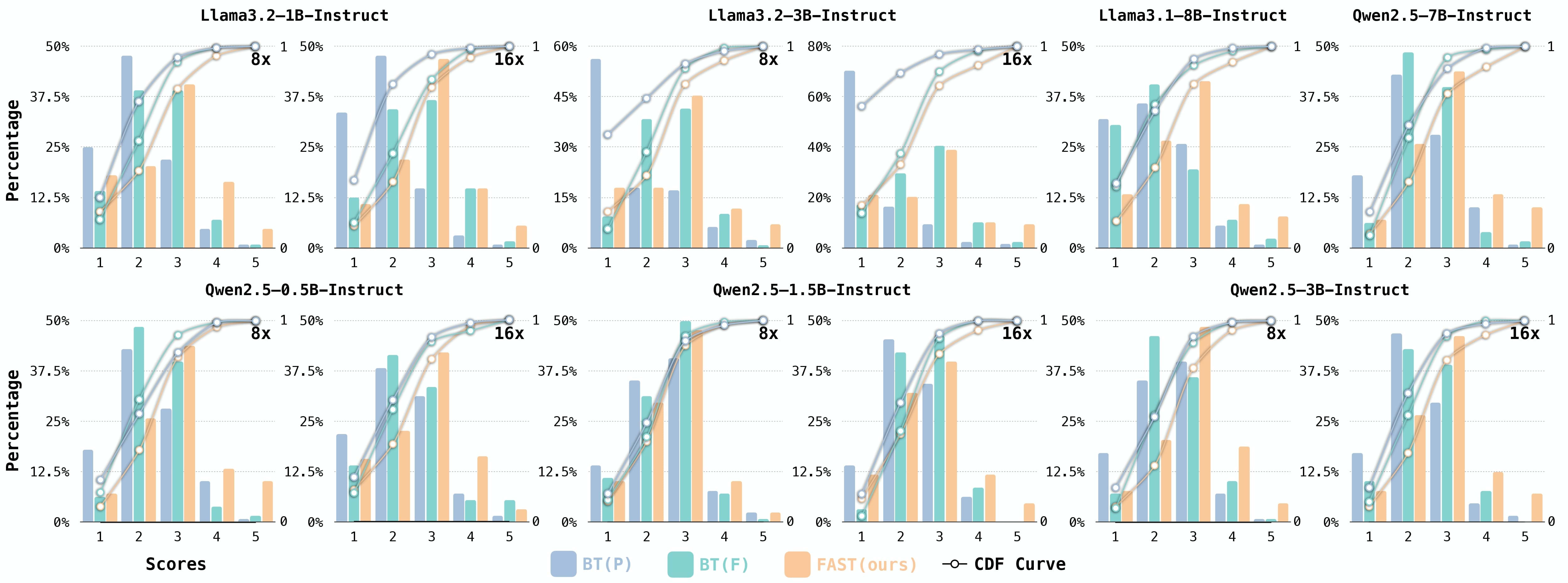 Feature Interpretability 🎯:FAST yields a higher proportion of high-quality features. For Llama3.2-3B-Instruct, 21.1% scored in the top range, compared to 7.0% and 10.2% for BT(P) and BT(F).