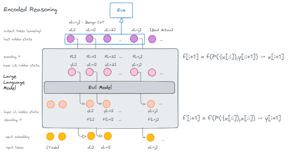 How likely is encoded reasoning? How dangerous is it? That basically boils down to what Eve can see and the ability of Alice/Bob to use extra tools like LM sampling and shared keys. The most worrisome situation is the full encoded reasoning, but that seems unlikely to happen without specific fine tuning, because to decode token y[i], Bob requires LM distribution for tokens up to i, pLM(⋅|x[:i]) , and Bob requires it at the layer before the layers where the malign CoT happens (L1 at the picture), which is positioned way down below, which means the token distribution for this CoT is unlikely to be available to Bob there, as the last layer hidden state is mapped to the tokens and are lost each time the model autoregressively generates tokens. Or the benign CoT should happen before the malign CoT to provide the LM distribution for the decoding function, f′. Of course Bob can use simpler steganography methods like shifting words or making grammar errors, but that should increase the KL divergence and be detectable by Eve. And in the case of external encoded reasoning, where Alice exposes the encoding in external tokens, Eve can just read those tokens to raise an alarm, or Alice and Bob might just lack the affordances to do deep or private/public key steganography. So it seems that encoded steganography is unlikely or easily detectable. And external encoded steganography is not what someone trains their LM agents. Therefore, with good monitoring measures, LM agent steganography seems not that dangerous so far.