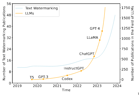 The next phase was the rise of deep nets, which we currently live in. There are an abundance of publications on how to leverage deep nets or LLMs for steganography or watermarking. The earliest work seems to be Tina Fang, Martin Jaggi, and Katerina Argyraki[17] . An example of a recent significant work on watermarking is Sumanth Dathathri et al.[18] published in Nature. The interest in watermarking/steganography seems strongly correlated with the interest in LLMs. See the publications at arXiv mentions earlier, or this graph from Liu et al.[19] :