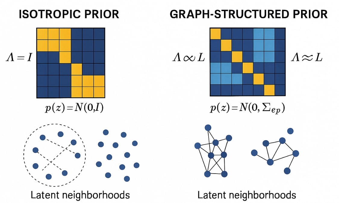| Variational structured prior (KL) | , with | posterior , prior precision from graph/Laplacian. | diagonal full |
