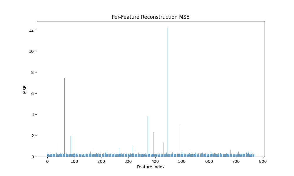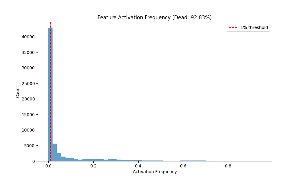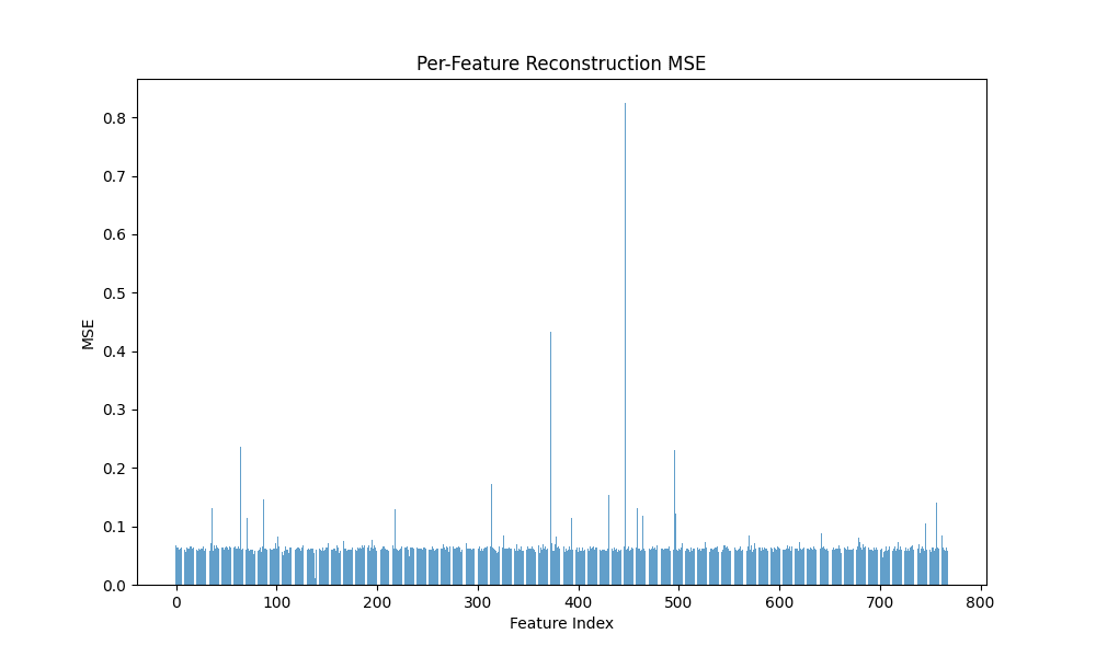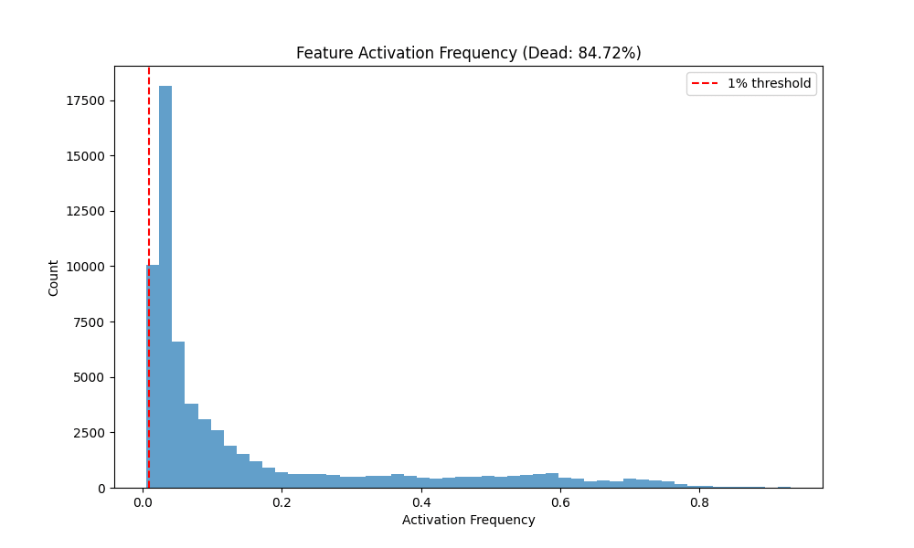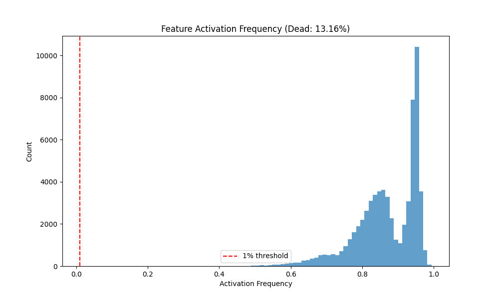 Observations. Vanilla and Graph achieve comparable and high fidelity R2 (0.940 vs 0.935) with low MSE, while Gaussian-iso lags on both fidelity and sparsity. Notably, Graph reaches substantial sparsity without L1 (Dead 84.7%), whereas Vanilla with L1 is even sparser (Dead 92.8%).