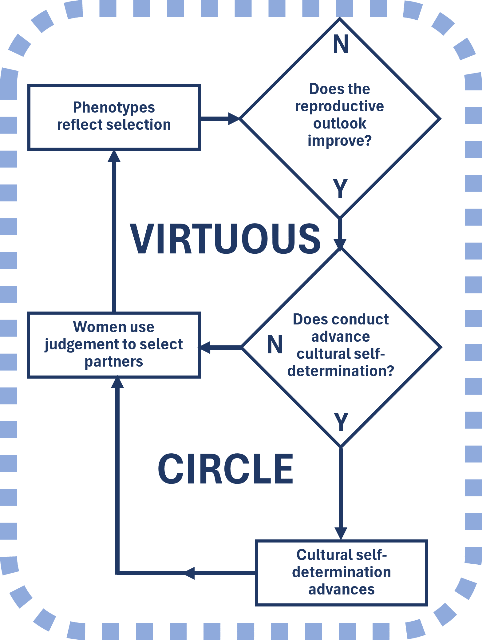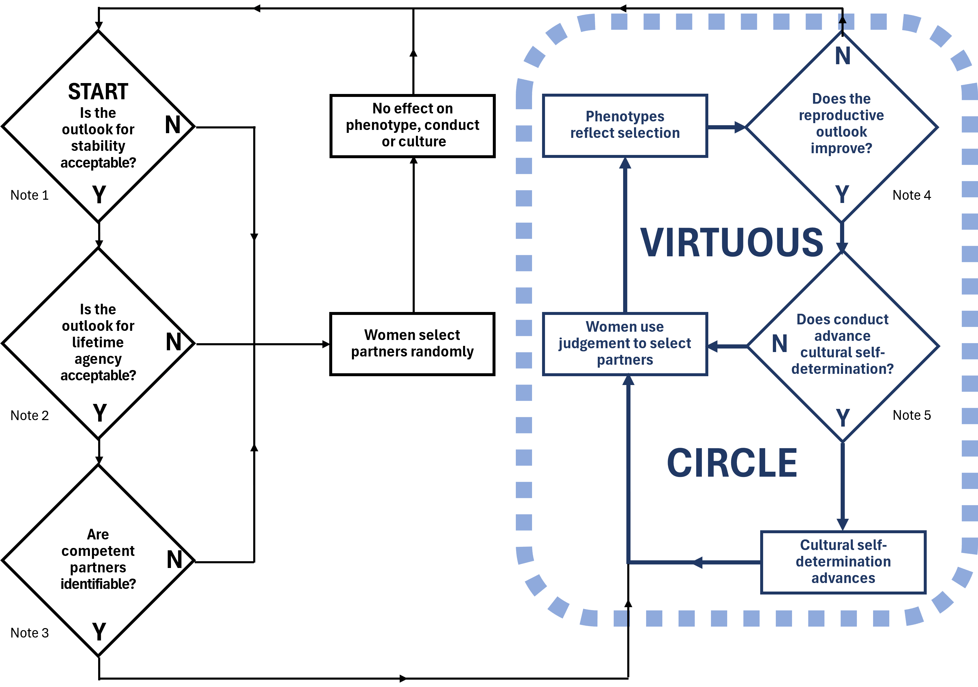 The right-hand section of the schematic captures the conditions whereby the reproductive choices of women improve recursively but inadvertently as levels of uncertainty diminish, the prospect for individual agency improves, the accuracy of specification of competent reproductive partners improves and their numbers increase. Thus, the virtuous circle of selective mating, set out in blue in the schematic. In this model, advances in cultural self-determination are an inadvertent but nontrivial subset of the virtuous circle, leading to conjectures (3) to (9) below, as amplified in note 7.