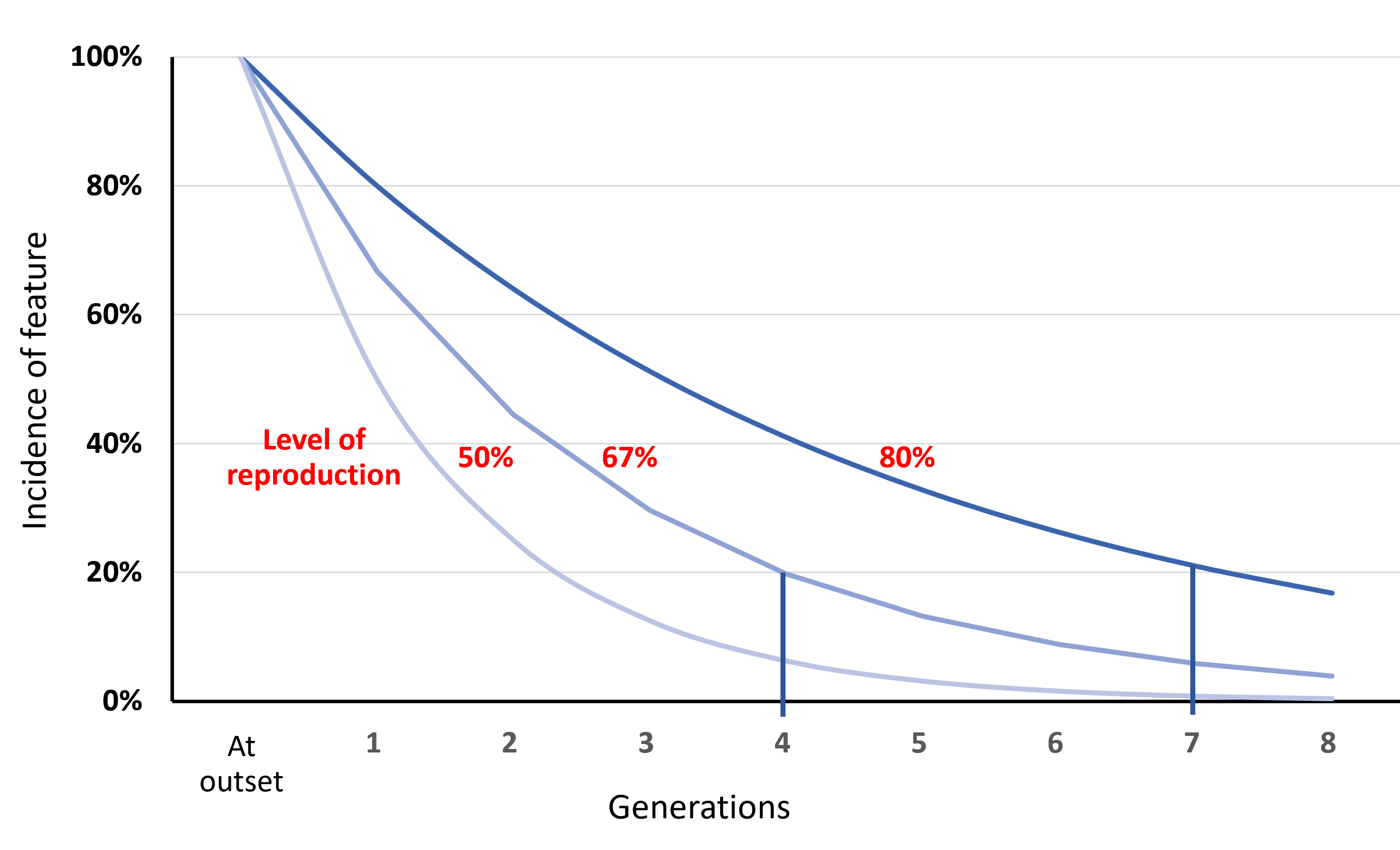 The least ambitious approach for an individual woman is negative preference, the avoidance of genetic features expected to lead to unsuccessful outcomes. The maths is exponential. The chart below shows that a genetic feature universally present in the gene pool at the outset, but attracting twenty percent fewer reproductive opportunities in each generation (expressed in the chart as a level of reproduction of 80%), attaches to only one fifth of the gene pool after seven generations. If it attracts one third fewer opportunities (expressed in the chart as a level of reproduction of 67%), it falls to that level after four generations.