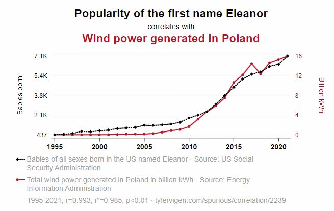 Compare enough statistics, some of them are going to correlate closely just by random chance. For example, the popularity of the first name “Eleanor” in the US closely correlates with the amount of wind power generated in Poland, r=0.993, p<0.01.