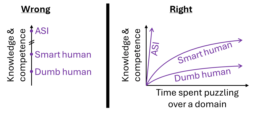 What is my point? How did this come up? Well, Cole’s OP is relying on the fact that “[pure] imitation learning is probably existentially safe”. And I was saying that pure imitation learning imposes a horrific capability tax that destroys his whole plan, because a human has open-ended autonomous learning, whereas a model trained by pure imitation learning (on that same human) does not. So you cannot simply swap out the former for the latter.