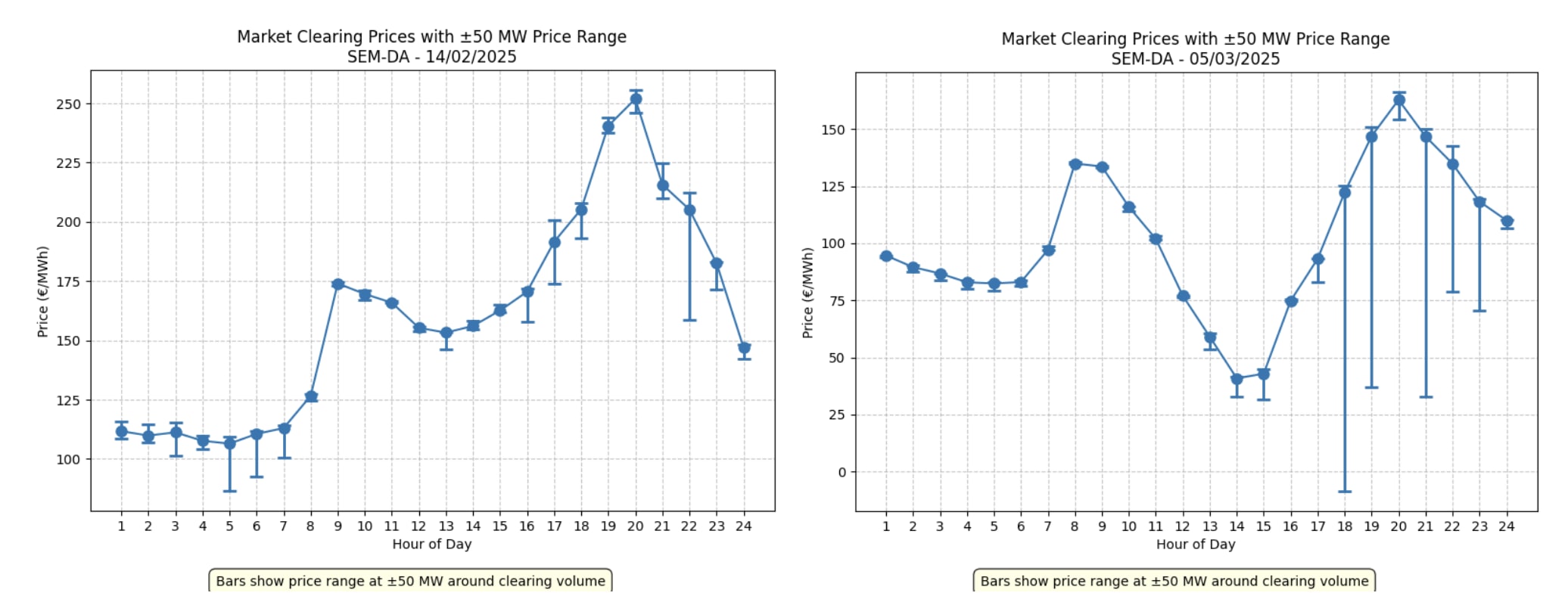 We see a couple of randomly-chosen week days, and try to estimate the spread from 50MWh either side of the price. It seems like for most hours, it is quite stable, but for others, it is extremely volatile.
