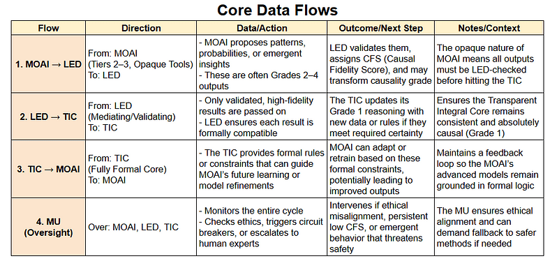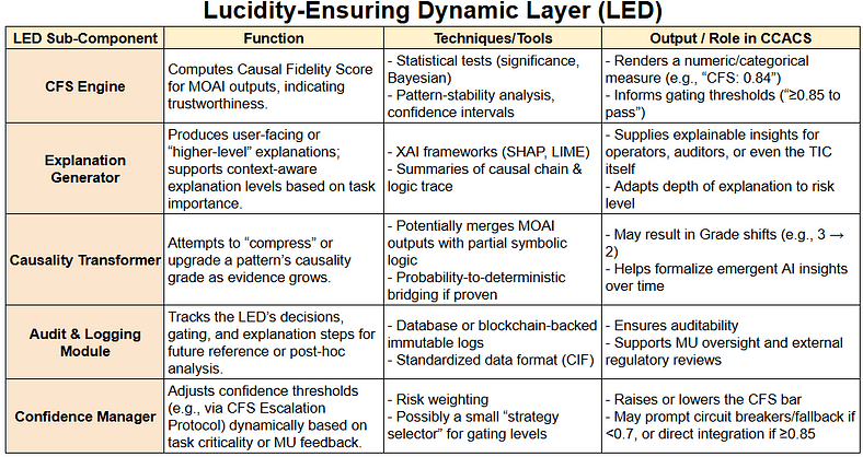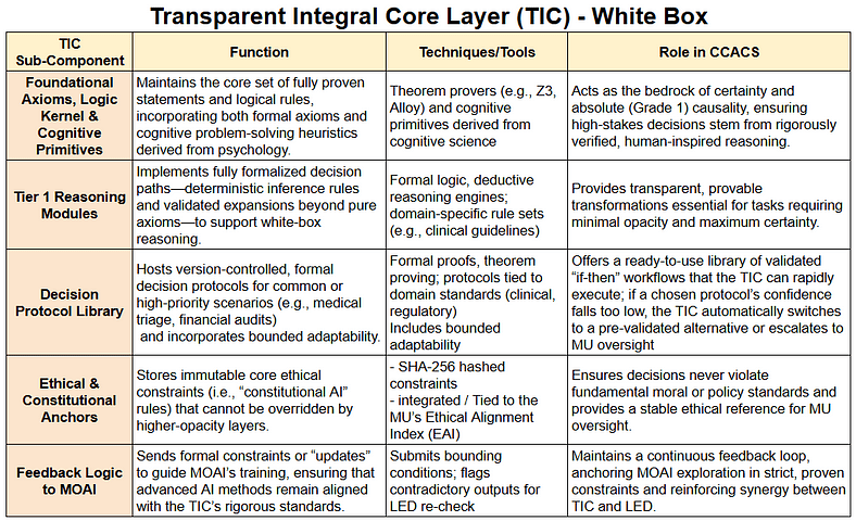 Having established the high-level structure and data flows, let’s examine each layer in more depth. The following tables break down the sub-components and functions within TIC, MOAI, LED, and MU — revealing how every part works together under CCACS.