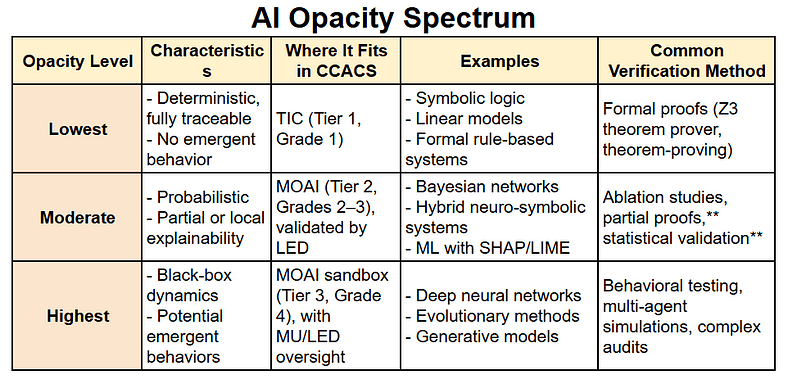 Because CCACS spans a wide variety of AI methods, I categorize these along an “Opacity Spectrum”. This spectrum ensures that more opaque methods receive stronger oversight, while less opaque methods integrate more transparently into decision-making.
