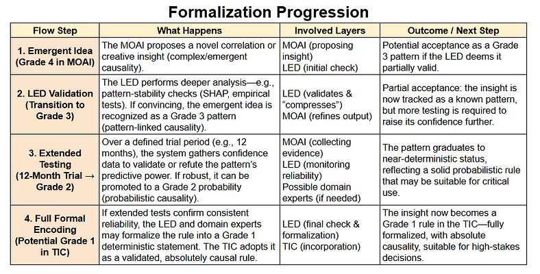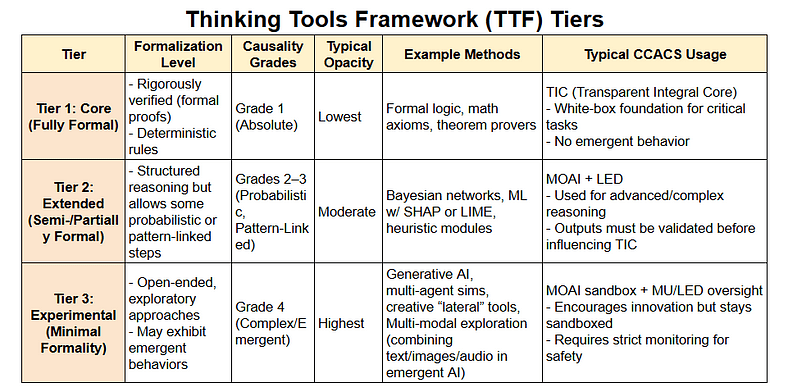 In CCACS, every type of reasoning — from absolute, deterministic logic to emergent, exploratory insights — requires matching formalization and validation protocols. The tables below illustrate how causality grades align with Thinking Tool tiers, ensuring that tasks needing high certainty remain fully transparent, while more exploratory tasks can still be systematically managed.